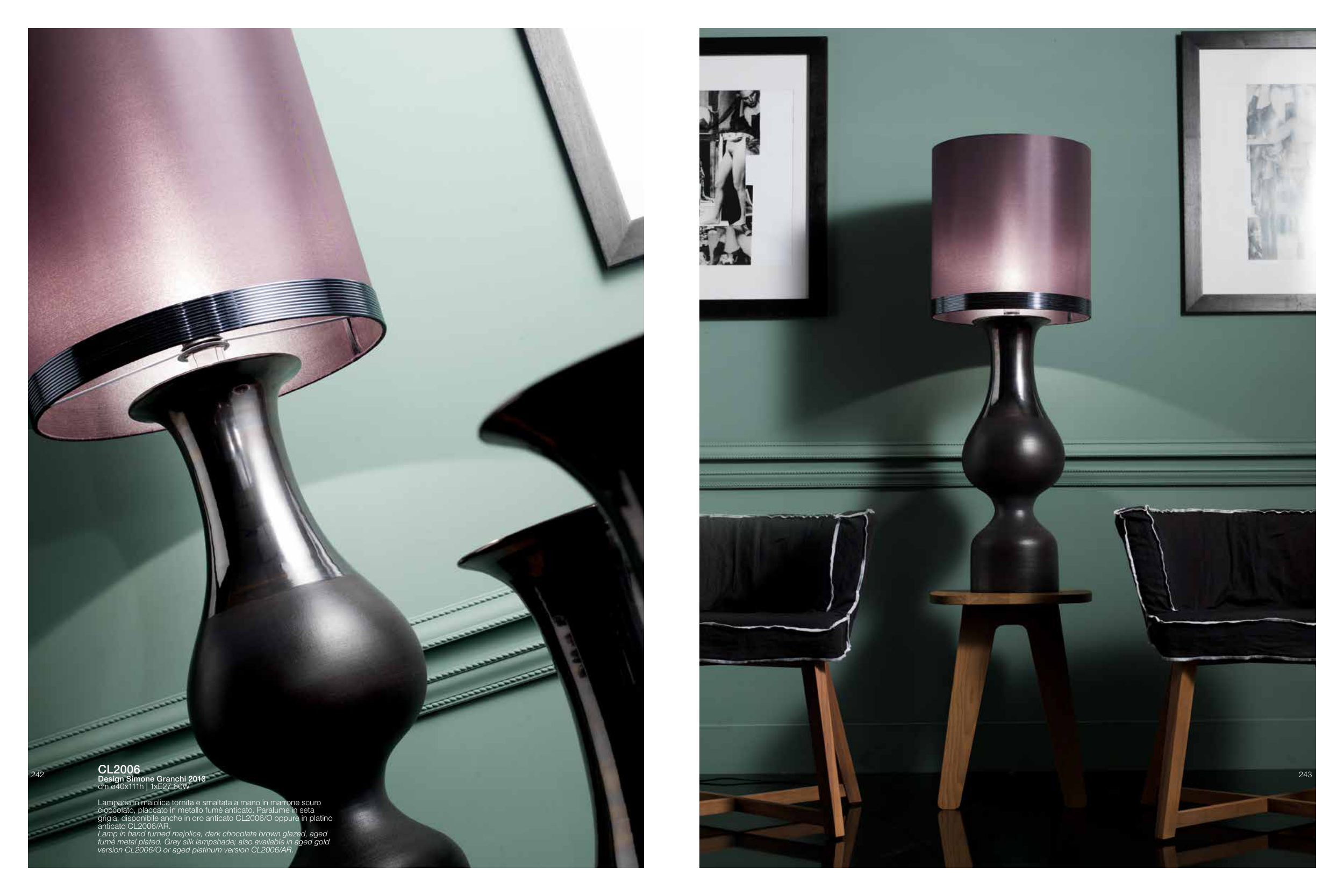 cioccolato, placcato in metallo fumé anticato. Paralume in seta