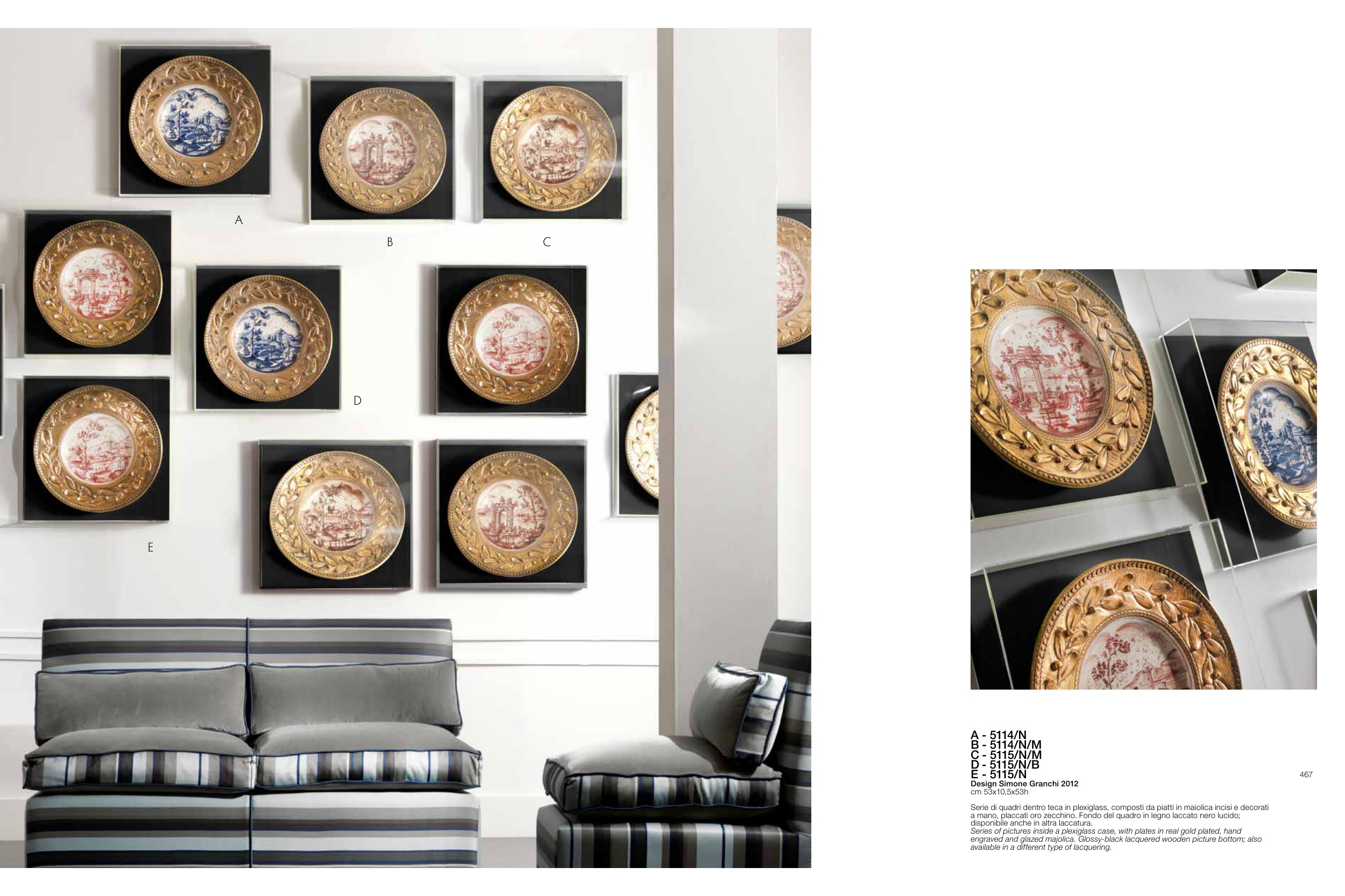 Serie di quadri dentro teca in plexiglass, composti da piatti in maiolica incisi e decorati