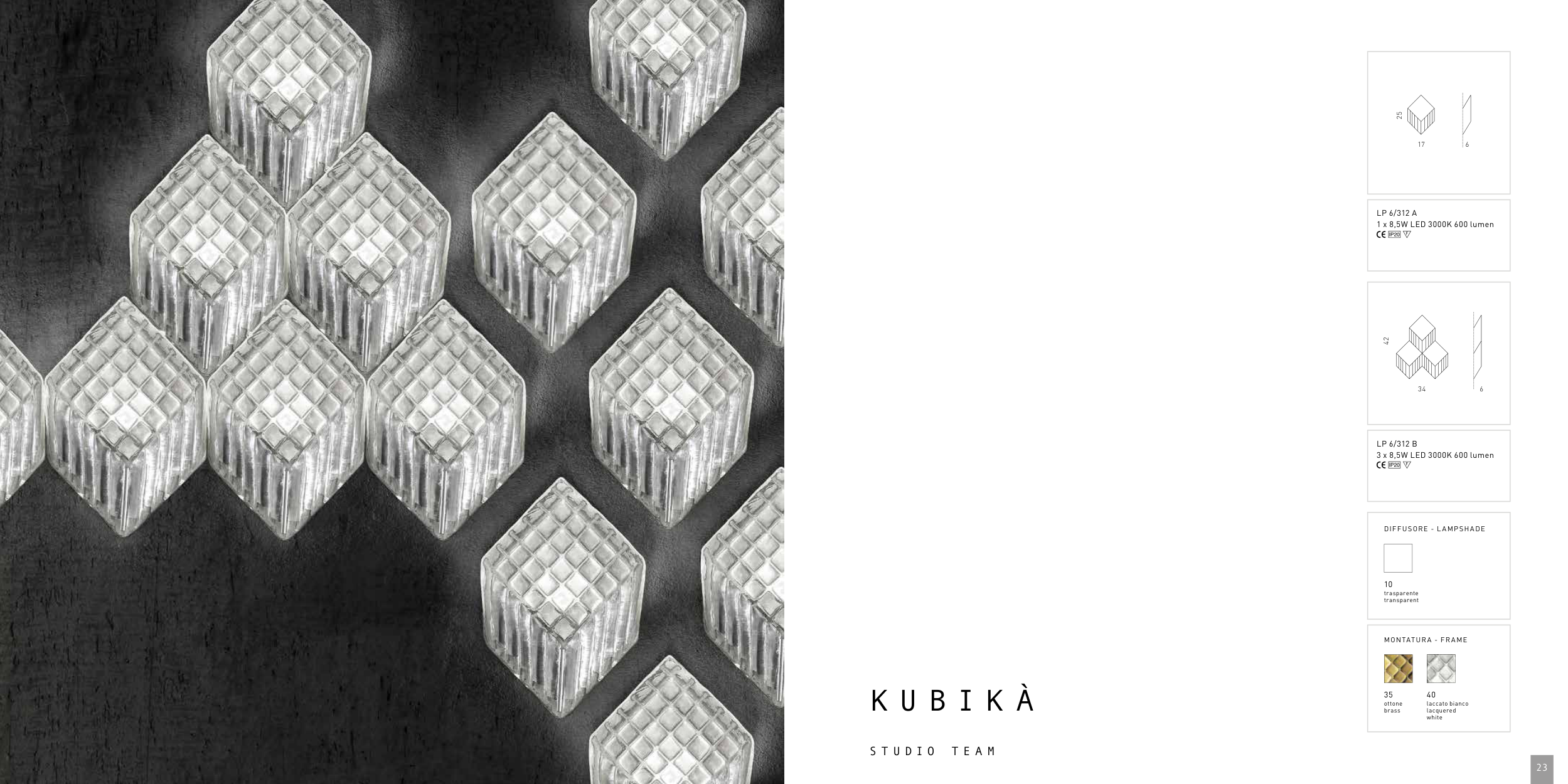LP 6/312 B 3 x 8,5W LED 3000K 600 lumen LP 6/312 A 1 x 8,5W LED 3000K 600 lumen 10 trasparente transparent 35 ottone brass 40 laccato bianco lacquered white DIFFUSORE - L AMPSHADE MONTATUR A - FR AME K U B I K À 17 34 6 6 25 42 S T U D I O T E A M 23