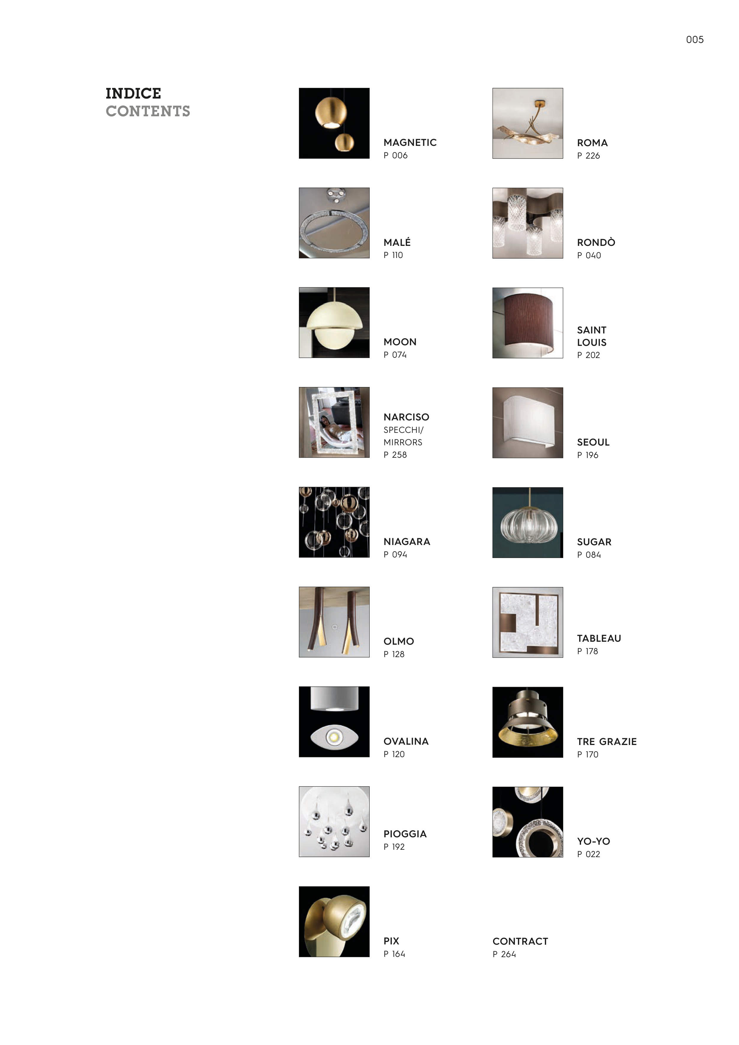 PIOGGIA P 192 MOON P 074 PIX P 164 NARCISO SPECCHI/ MIRRORS P 258 ROMA P 226 NIAGARA P 094 OLMO P 128 OVALINA P 120 YO-YO P 022 CONTRACT P 264 RONDÒ P 040 SAINT LOUIS P 202 SEOUL P 196 SUGAR P 084 TABLEAU P 178 TRE GRAZIE P 170 MAGNETIC P 006 MALÉ P 110 INDICE CONTENTS 005