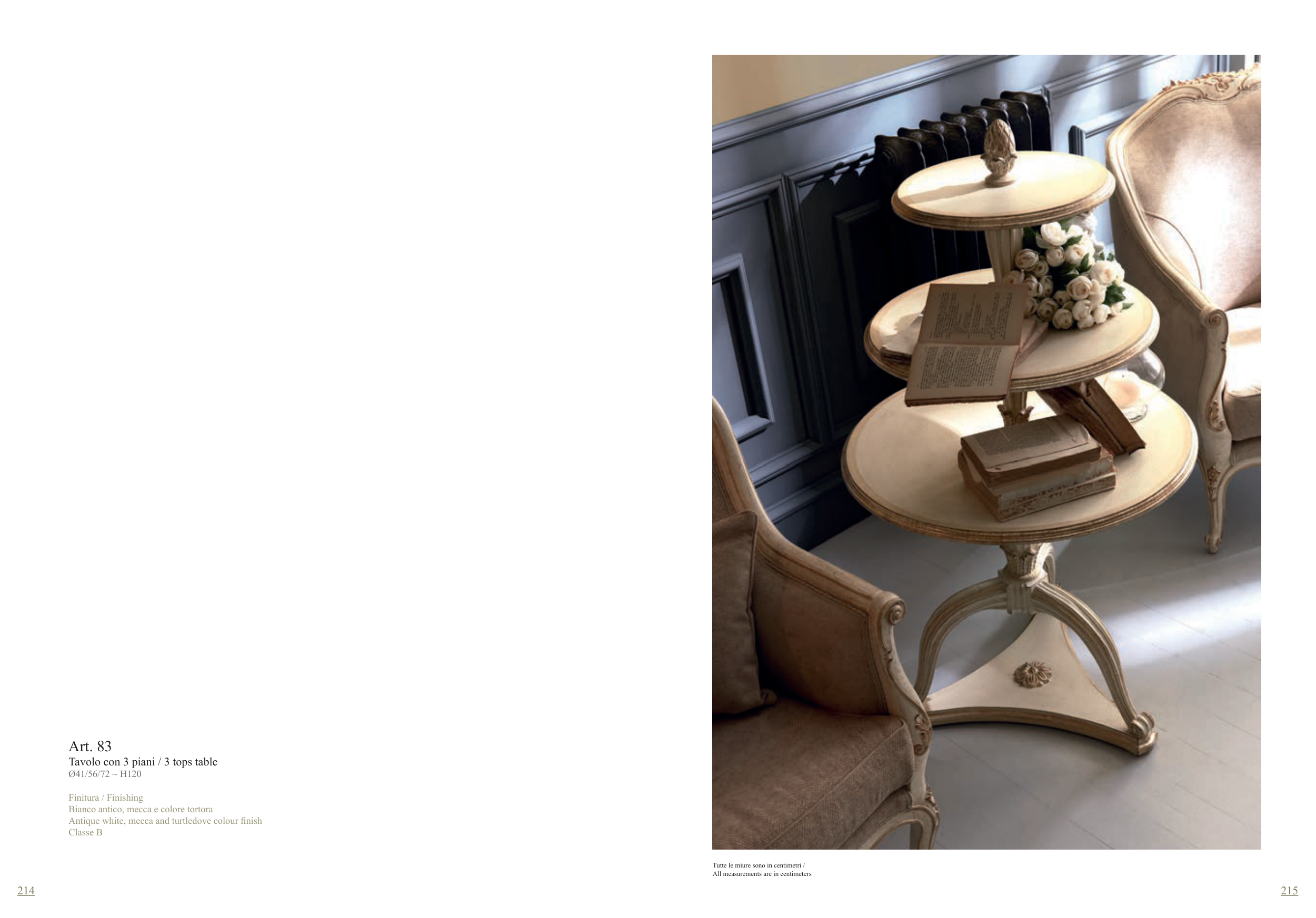 214 215 Tutte le miure sono in centimetri / All measurements are in centimeters Art. 83 Tavolo con 3 piani / 3 tops table Ø41/56/72 ~ H120 Finitura / Finishing Bianco antico, mecca e colore tortora Antique white, mecca and turtledove colour finish Classe B