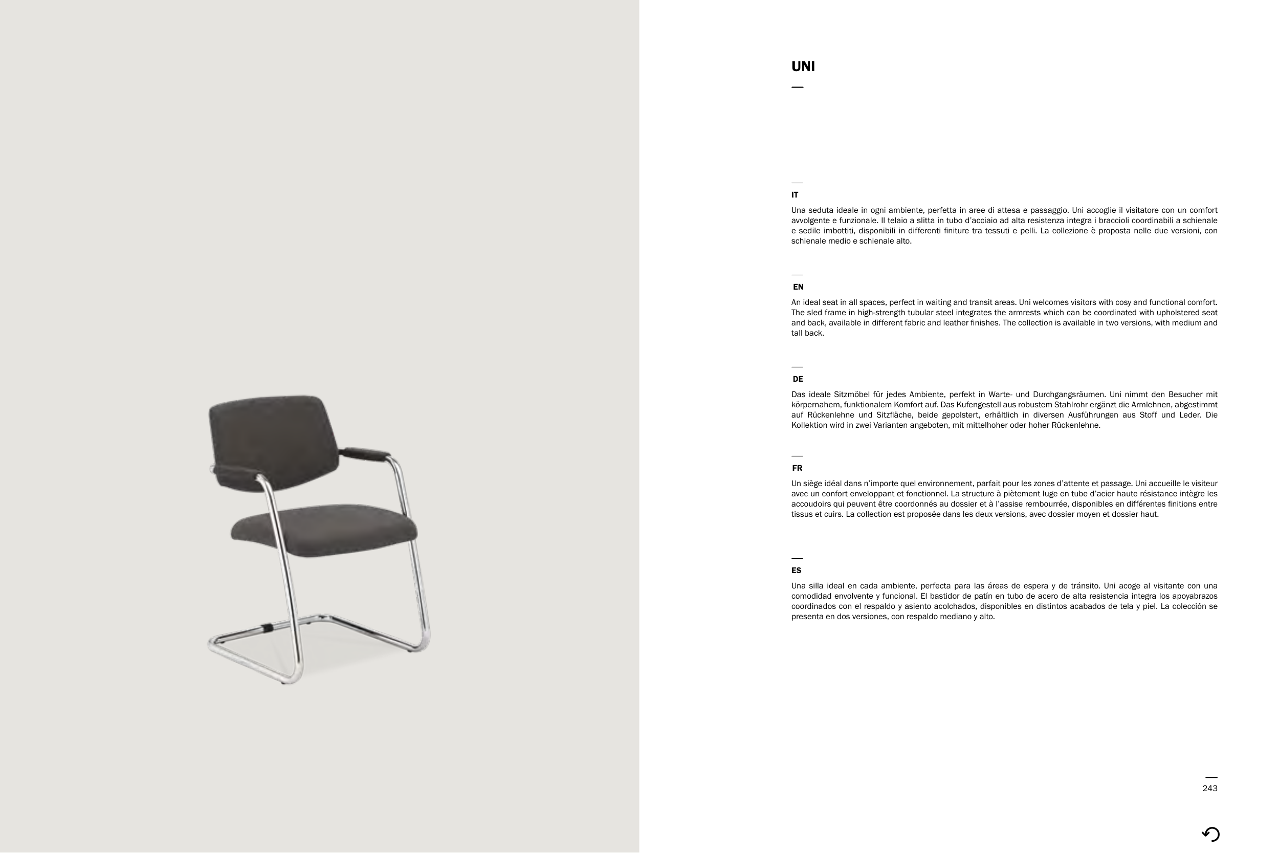 Una seduta ideale in ogni ambiente, perfetta in aree di attesa e passaggio. Uni accoglie il visitatore con un comfort