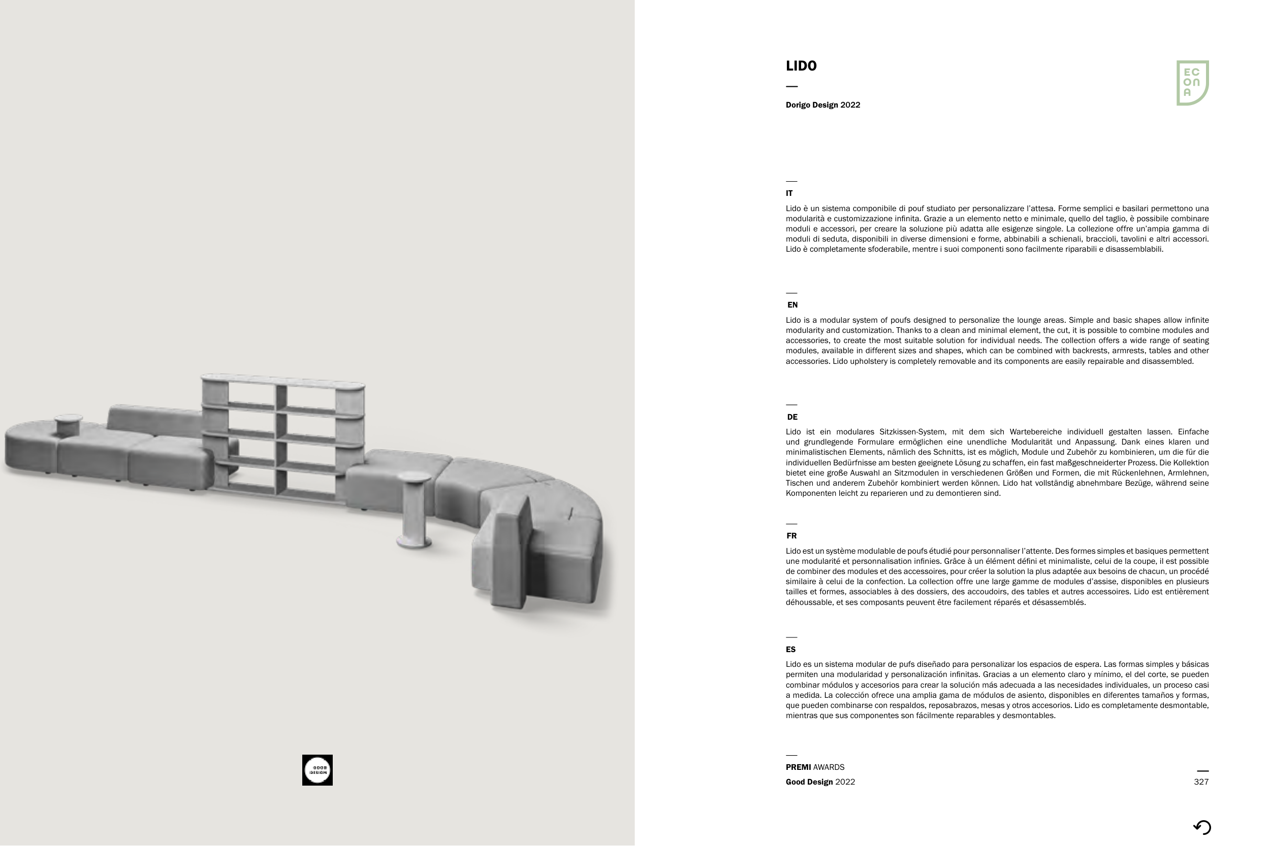 Lido è completamente sfoderabile, mentre i suoi componenti sono facilmente riparabili e disassemblabili.