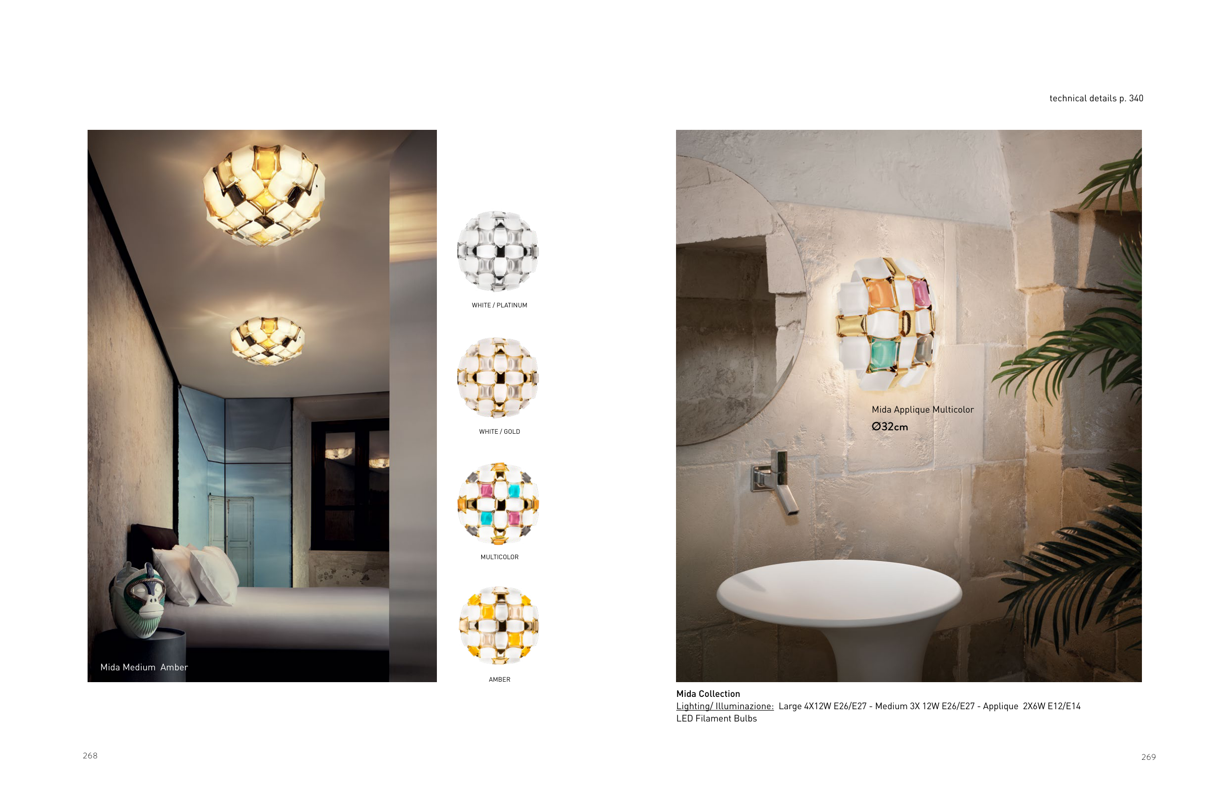 269 268 Mida Medium Amber WHITE / PLATINUM WHITE / GOLD AMBER MULTICOLOR Mida Collection Lighting/ Illuminazione: Large 4X12W E26/E27 - Medium 3X 12W E26/E27 - Applique 2X6W E12/E14 LED Filament Bulbs Mida Applique Multicolor Ø32cm technical details p. 340