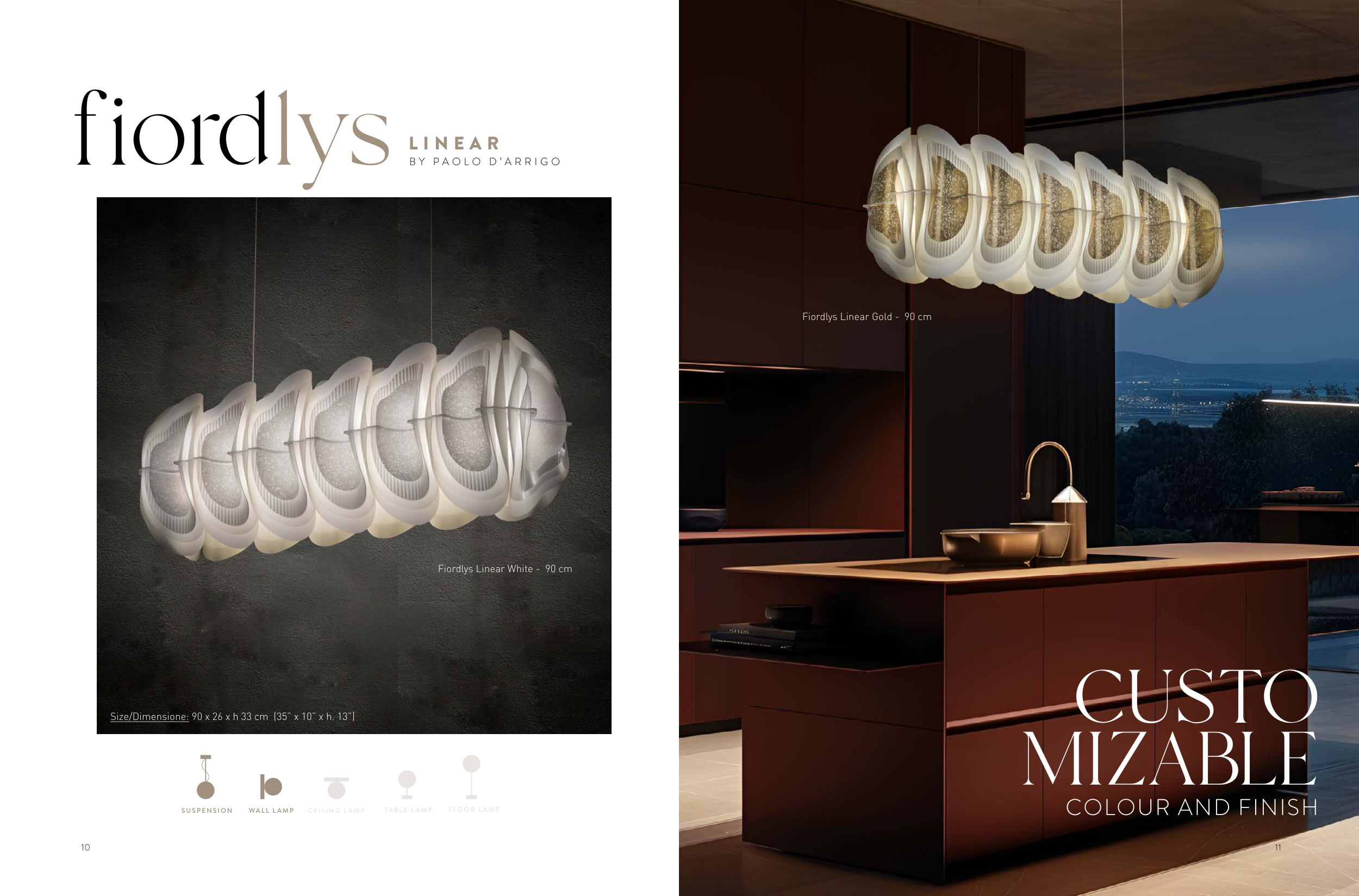 10 fiordlys B Y P A O L O D ’ A R R I G O L I N E A R 11 CEILING L AMP WALL L AMP TABLE L AMP FLOOR L AMP SUSPENSION Size/Dimensione: 90 x 26 x h 33 cm (35” x 10” x h. 13”) Fiordlys Linear White - 90 cm Fiordlys Linear Gold - 90 cm CUSTO MIZABLE COLOUR AND FINISH