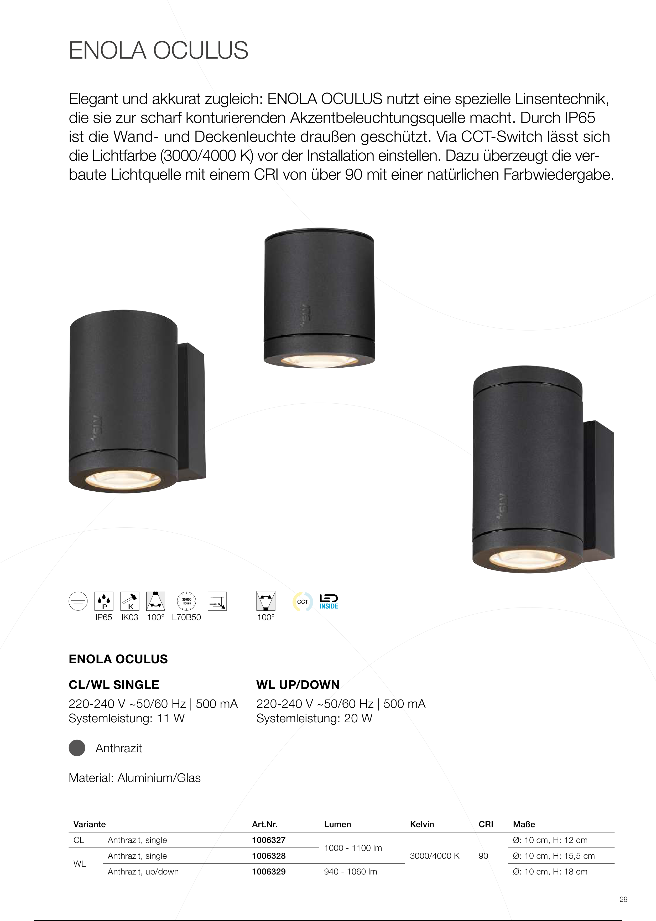 ist die Wand- und Deckenleuchte draußen geschützt. Via CCT-Switch lässt sich