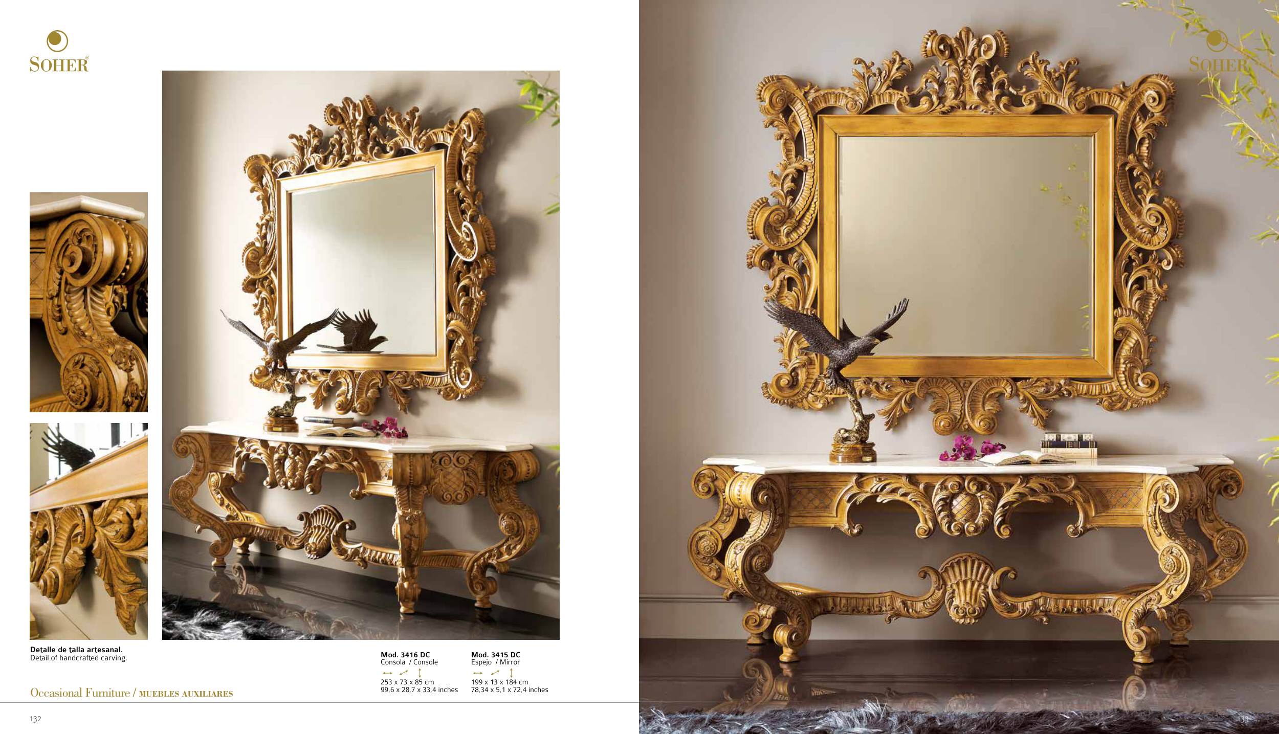 132 Mod. 3416 DC Consola / Console 253 x 73 x 85 cm 99,6 x 28,7 x 33,4 inches Mod. 3415 DC Espejo / Mirror 199 x 13 x 184 cm 78,34 x 5,1 x 72,4 inches 133 Detalle de talla artesanal. Detail of handcrafted carving. Occasional Furniture / MUEBLES AUXILIARES