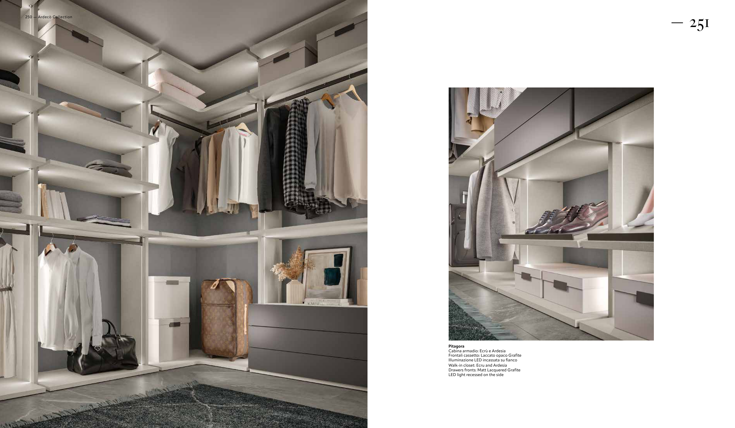 Pitagora Cabina armadio: Ecrù e Ardesia Frontali cassetto: Laccato opaco Grafite Illuminazione LED incassata su fianco Walk-in closet: Ecru and Ardesia Drawers fronts: Matt Lacquered Grafite LED light recessed on the side 250 — Ardecò Collection — 251