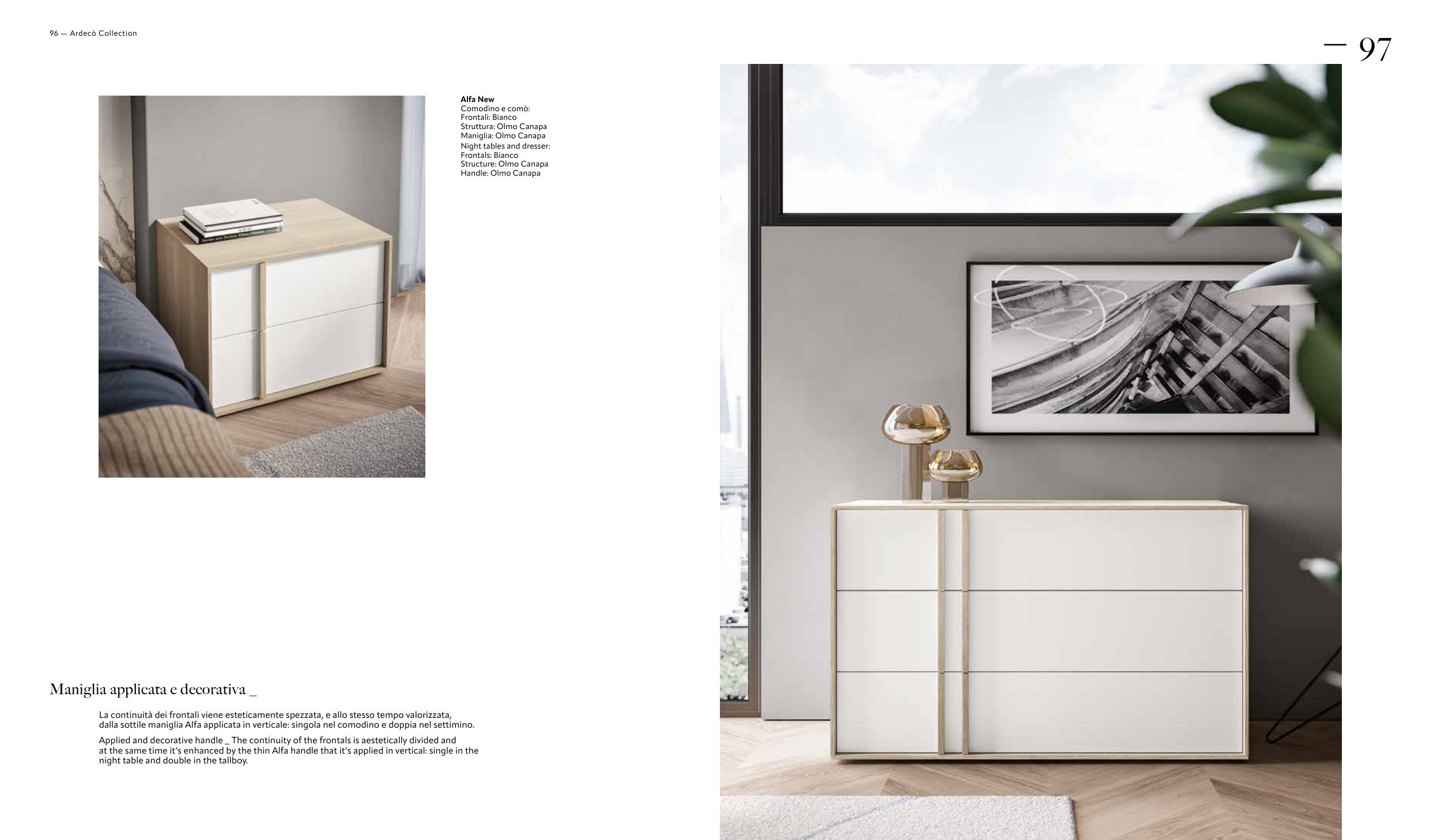 dalla sottile maniglia Alfa applicata in verticale: singola nel comodino e doppia nel settimino.