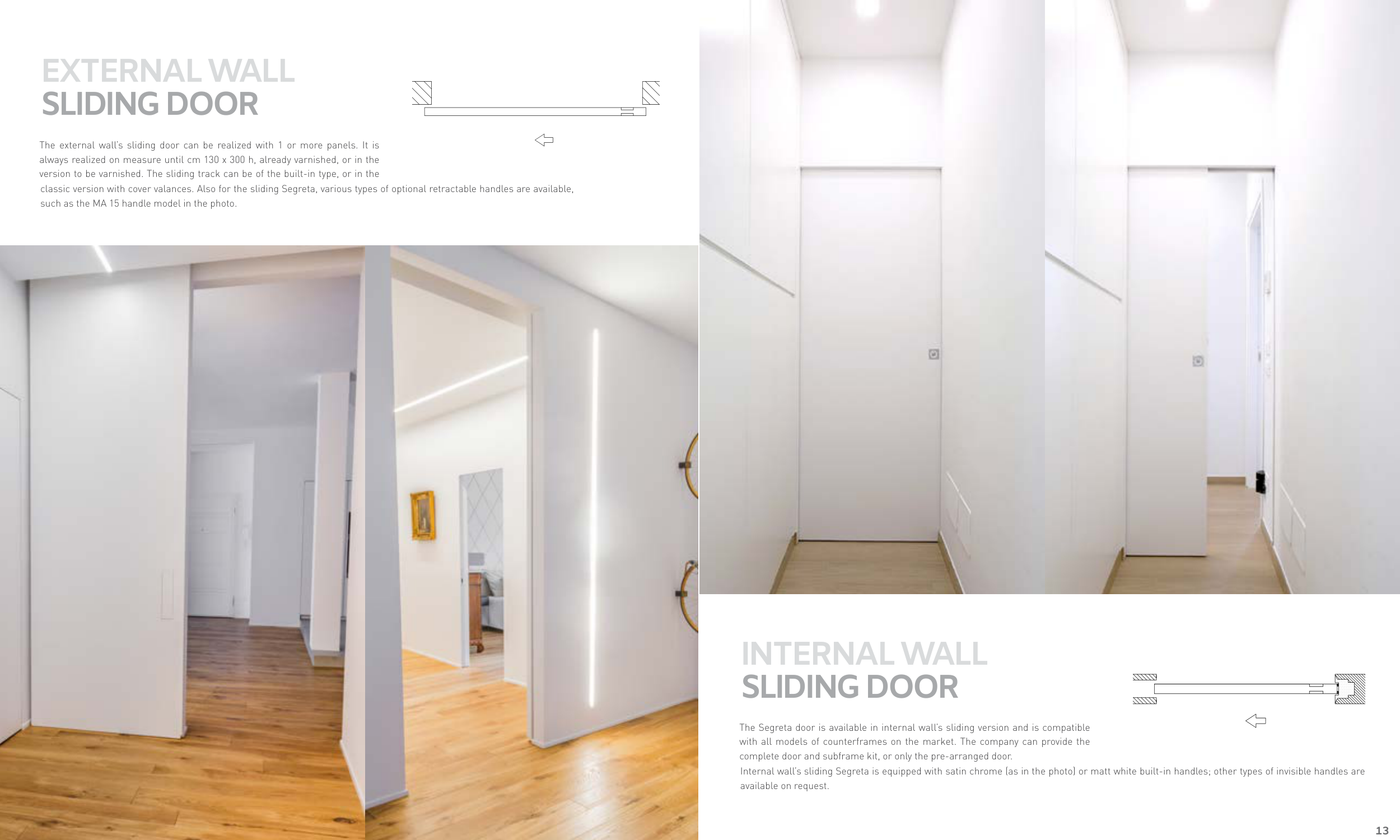 Internal wall’s sliding Segreta is equipped with satin chrome (as in the photo) or matt white built-in handles; other types of invisible handles are