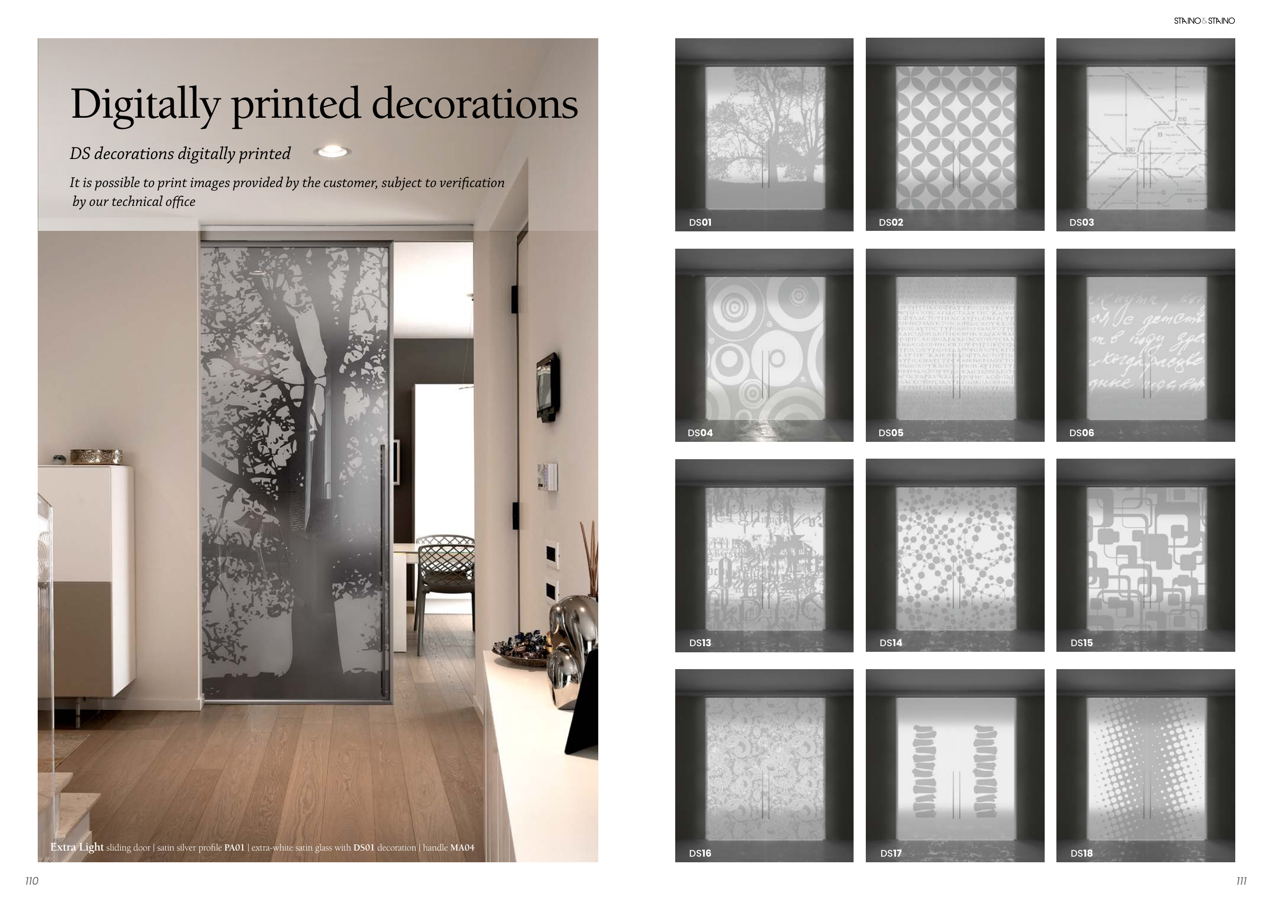 Extra Light sliding door | satin silver profile PA01 | extra-white satin glass with DS01 decoration | handle MA04
