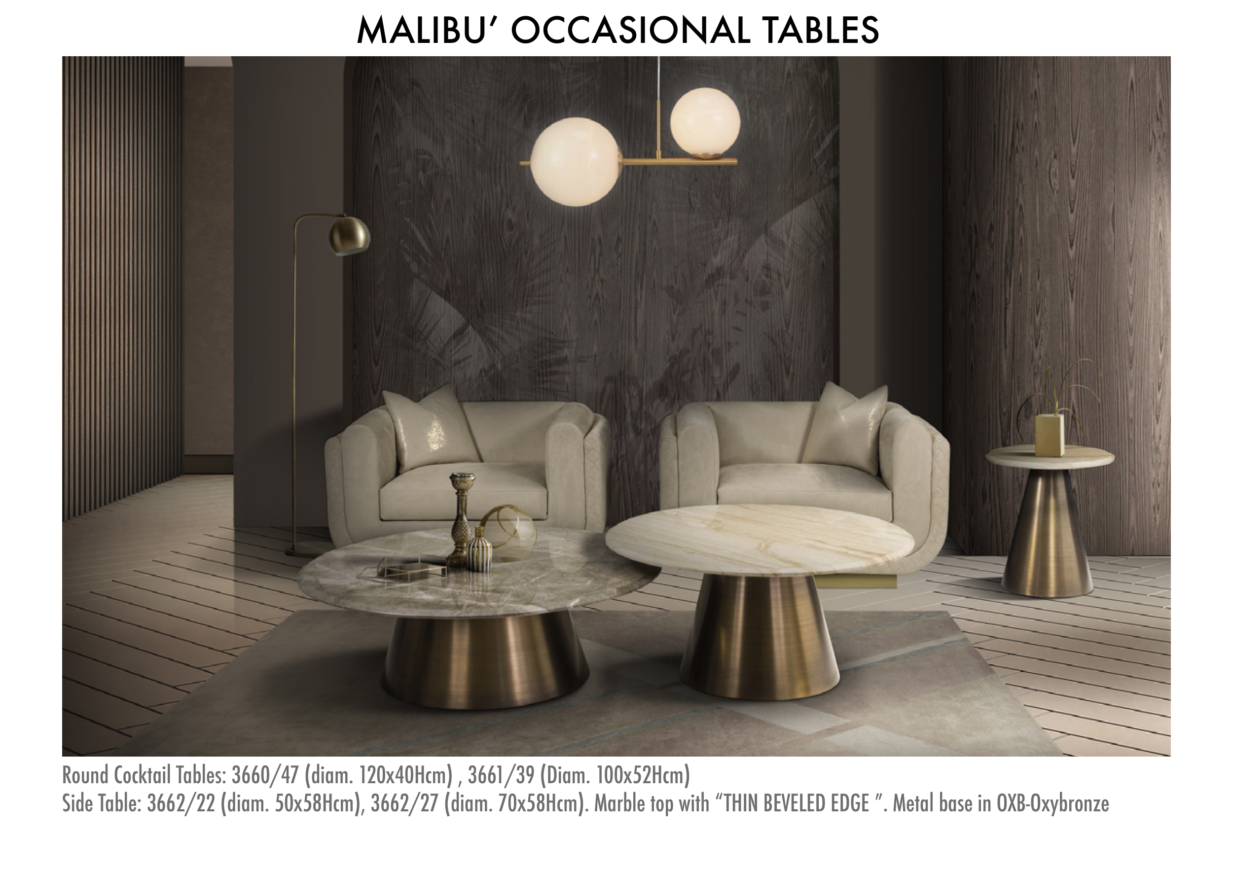 Side Table: 3662/22 (diam. 50x58Hcm), 3662/27 (diam. 70x58Hcm). Marble top with “THIN BEVELED EDGE ”. Metal base in OXB-Oxybronze