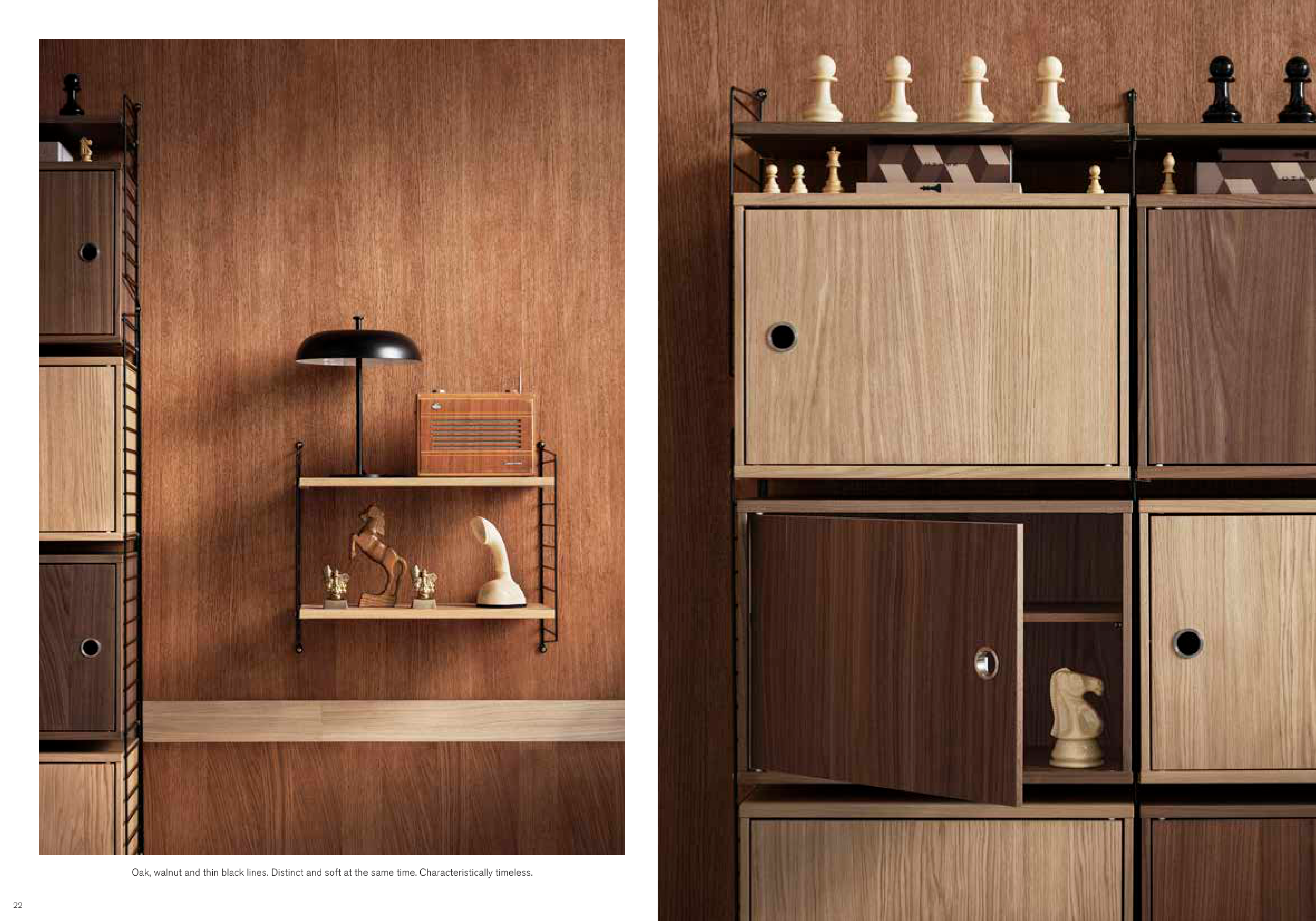 Oak, walnut and thin black lines. Distinct and soft at the same time. Characteristically timeless.