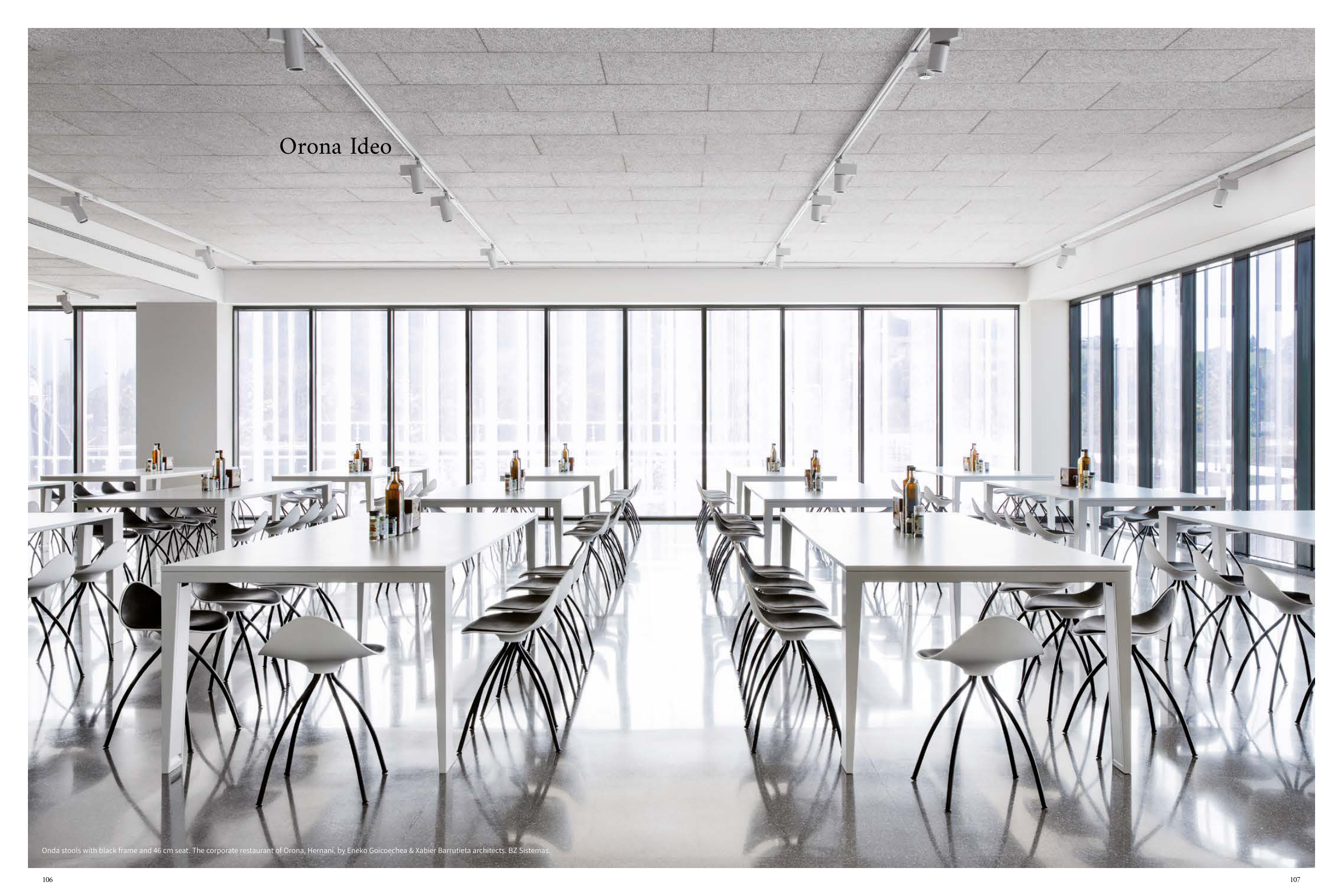 Onda stools with black frame and 46 cm seat. The corporate restaurant of Orona, Hernani, by Eneko Goicoechea & Xabier Barrutieta architects. BZ Sistemas.