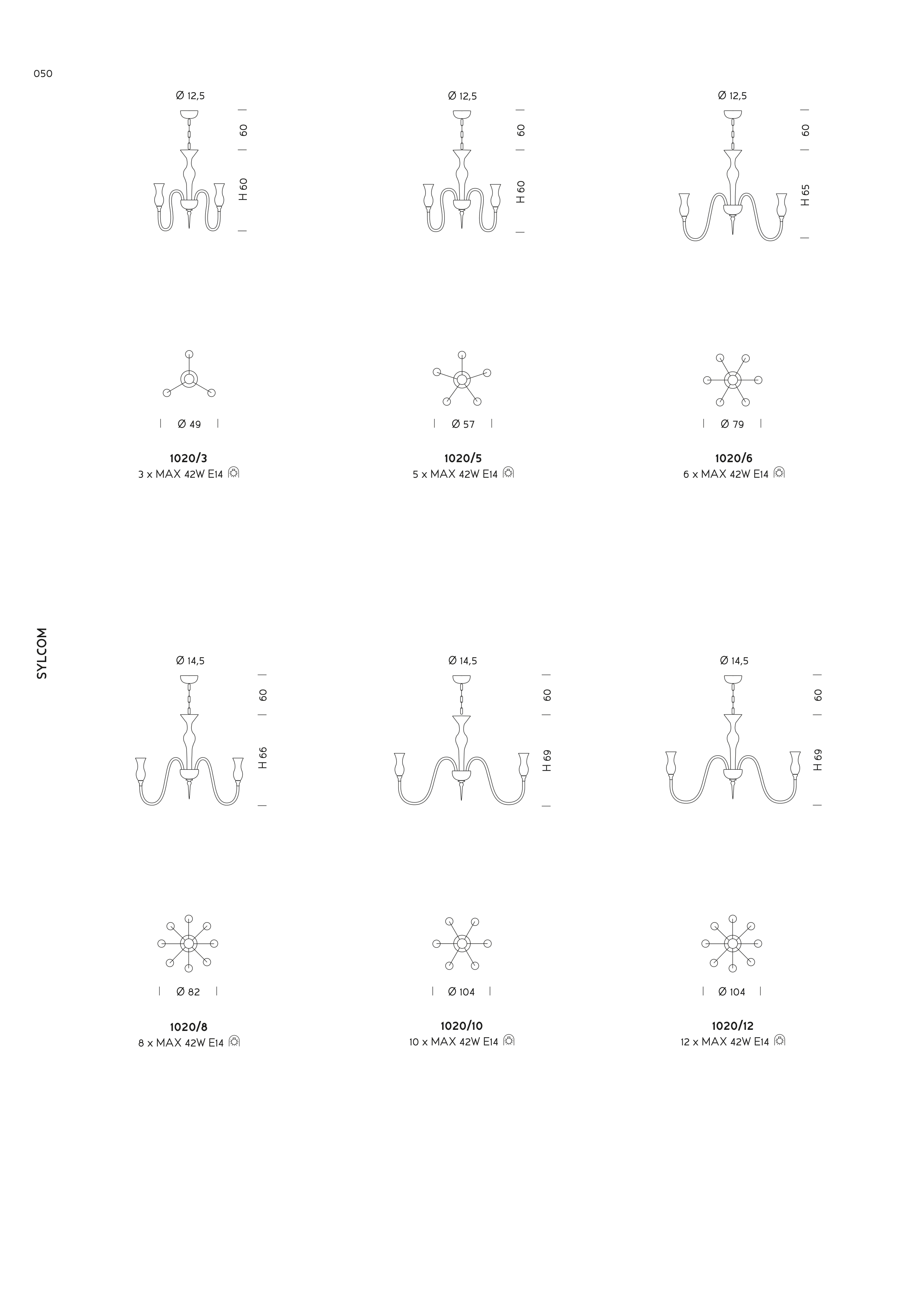 60 H 66 Ø 82 Ø 14,5 1020/8 8 x MAX 42W E14 60 H 69 Ø 14,5 Ø 104 1020/10 10 x MAX 42W E14 60 H 69 Ø 14,5 Ø 104 1020/12 12 x MAX 42W E14 60 H 60 Ø 12,5 60 H 60 Ø 12,5 60 H 65 Ø 12,5 Ø 79 1020/6 6 x MAX 42W E14 Ø 57 1020/5 5 x MAX 42W E14 Ø 49 1020/3 3 x MAX 42W E14 SYLCOM 050