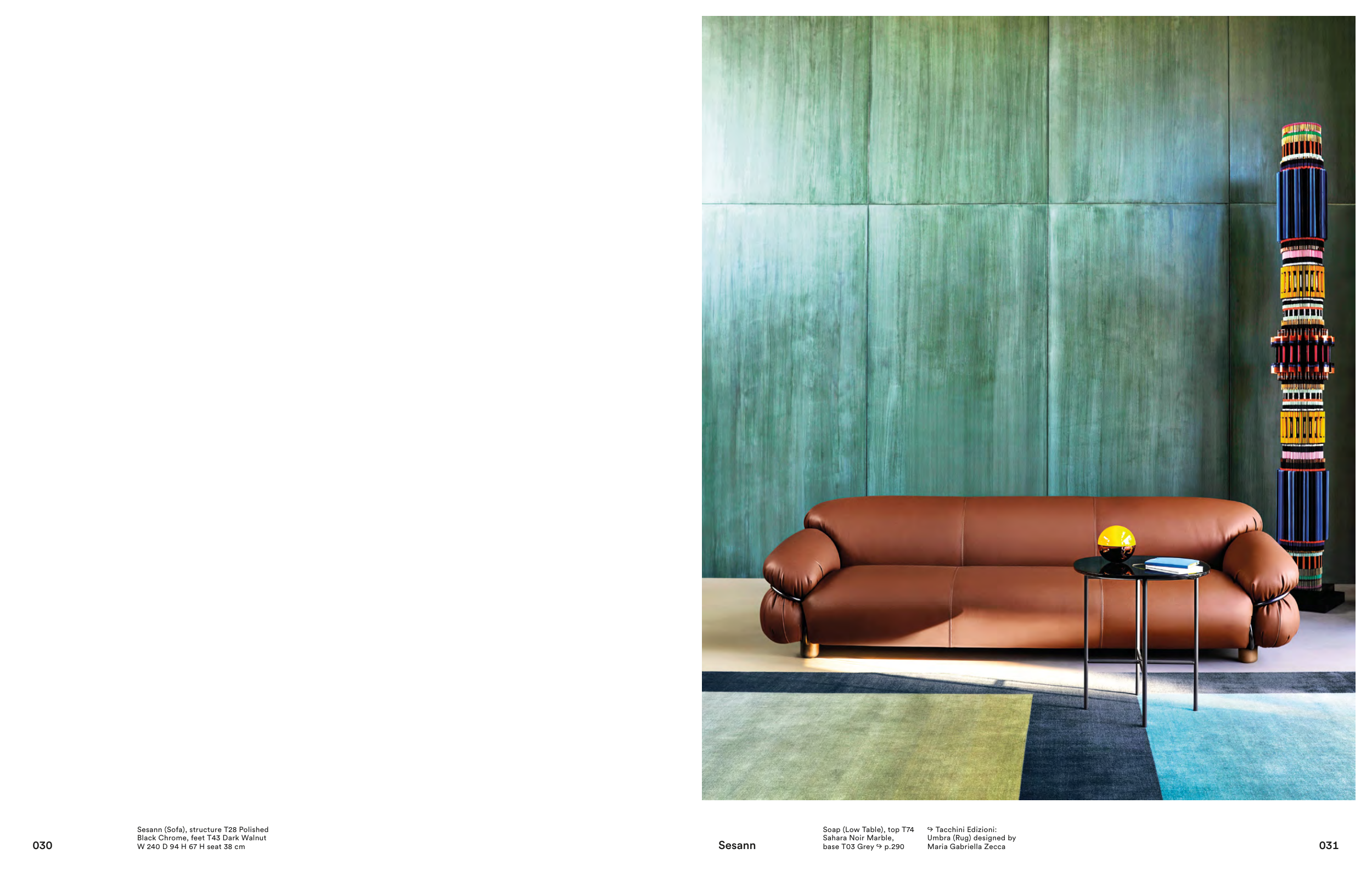 Sesann Soap (Low Table), top T74 Sahara Noir Marble, base T03 Grey ↪ p.290 ↪ Tacchini Edizioni: Umbra (Rug) designed by Maria Gabriella Zecca 031 Sesann (Sofa), structure T28 Polished Black Chrome, feet T43 Dark Walnut W 240 D 94 H 67 H seat 38 cm 030
