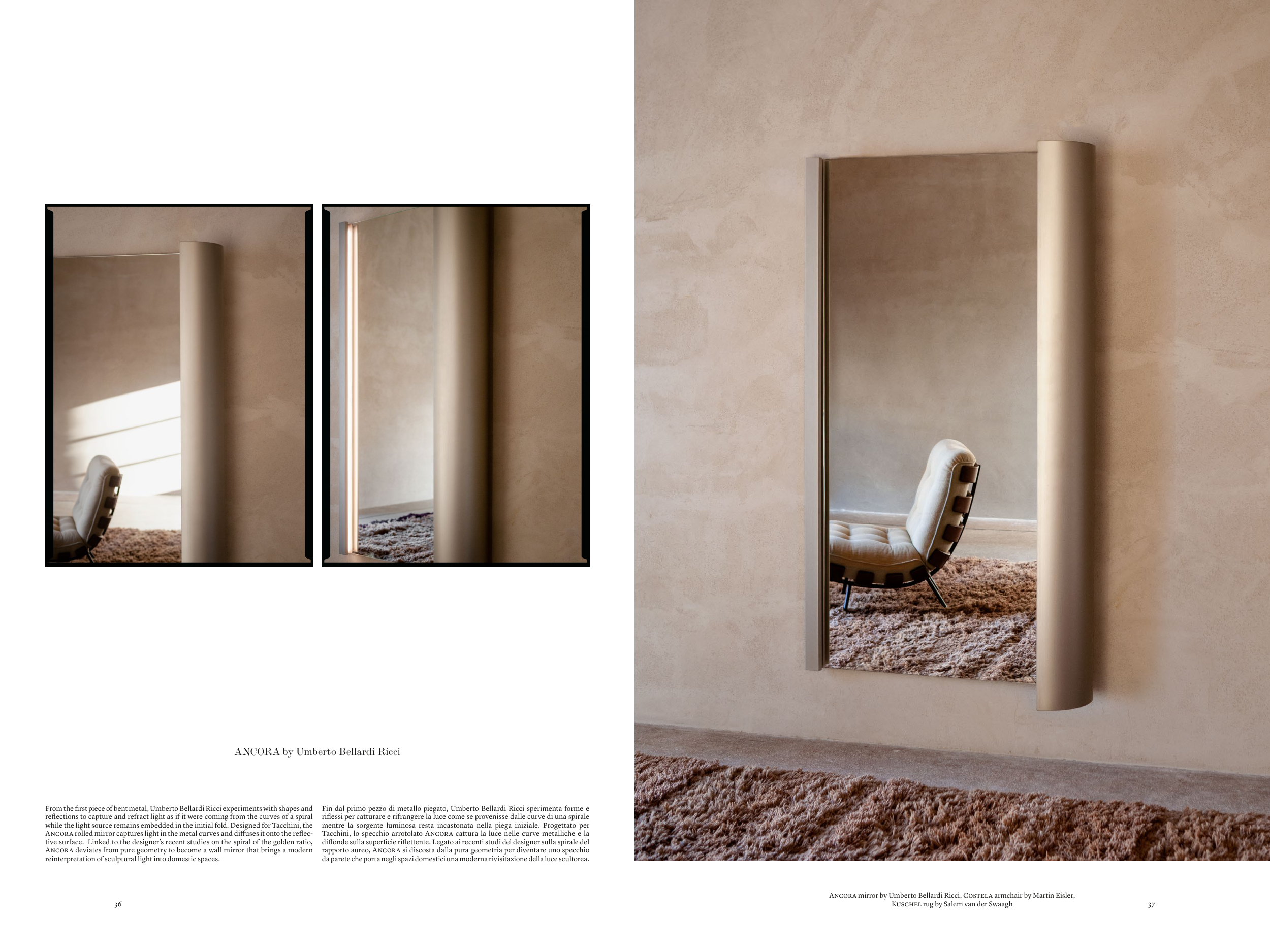 Ancora rolled mirror captures light in the metal curves and diffuses it onto the reflec-