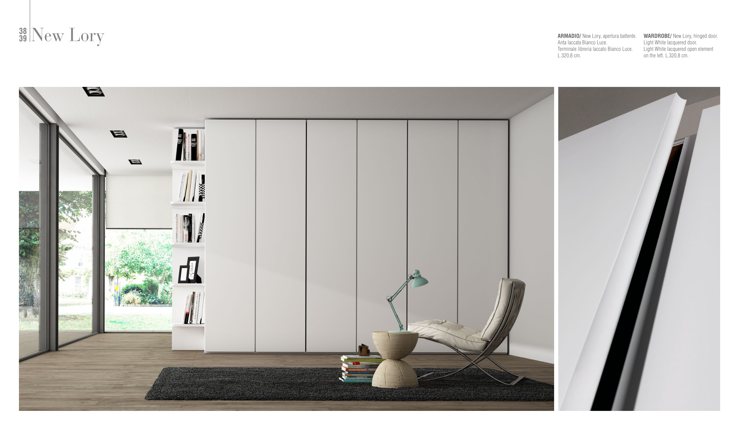 38 39 New Lory ARMADIO/ New Lory, apertura battente. Anta laccata Bianco Luce. Terminale libreria laccato Bianco Luce. L.320,8 cm. WARDROBE/ New Lory, hinged door. Light White lacquered door. Light White lacquered open element on the left. L.320,8 cm.