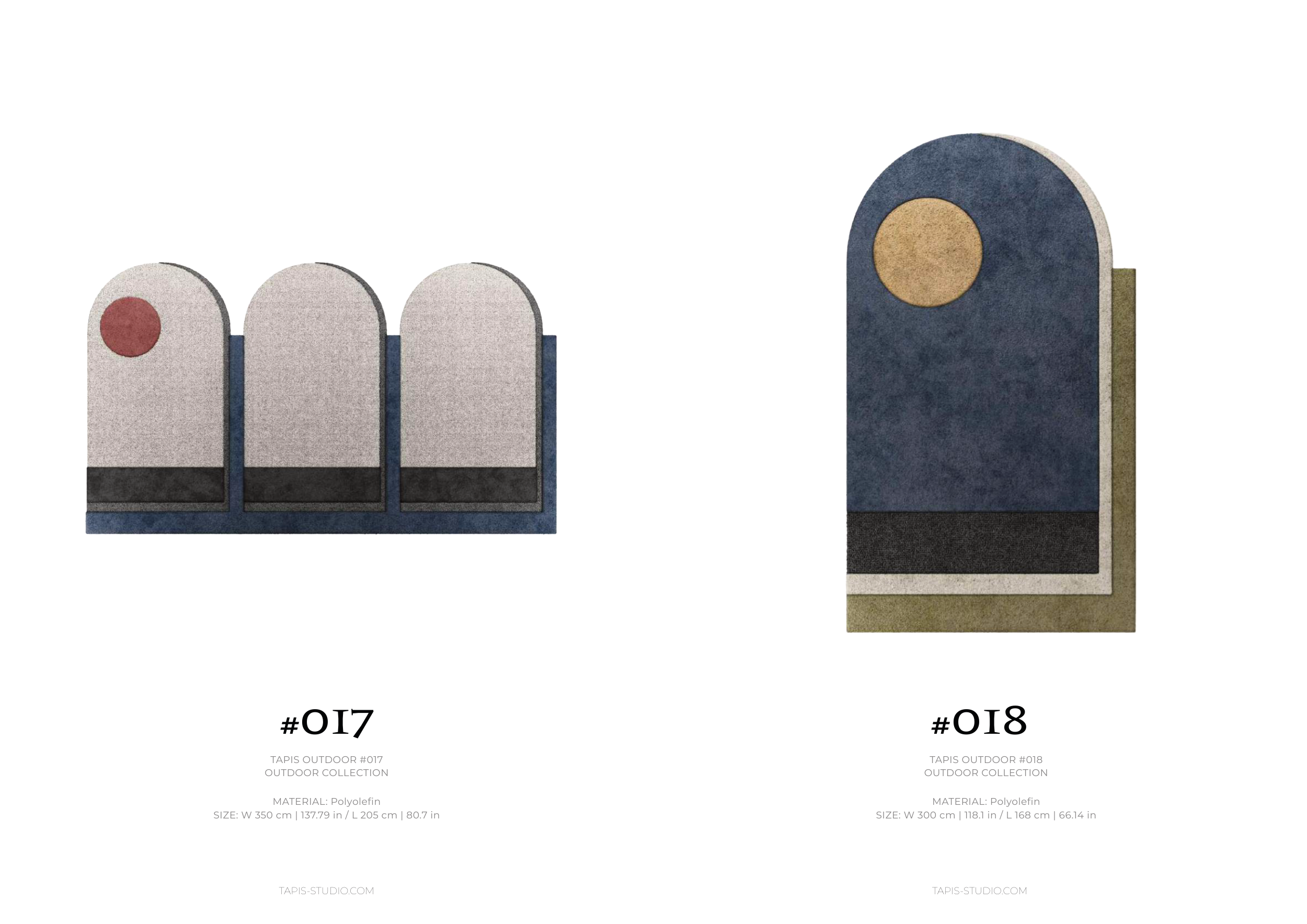 TAPIS-STUDIO.COM TAPIS-STUDIO.COM #017 MATERIAL: Polyolefin SIZE: W 350 cm | 137.79 in / L 205 cm | 80.7 in TAPIS OUTDOOR #017 OUTDOOR COLLECTION #018 MATERIAL: Polyolefin SIZE: W 300 cm | 118.1 in / L 168 cm | 66.14 in TAPIS OUTDOOR #018 OUTDOOR COLLECTION