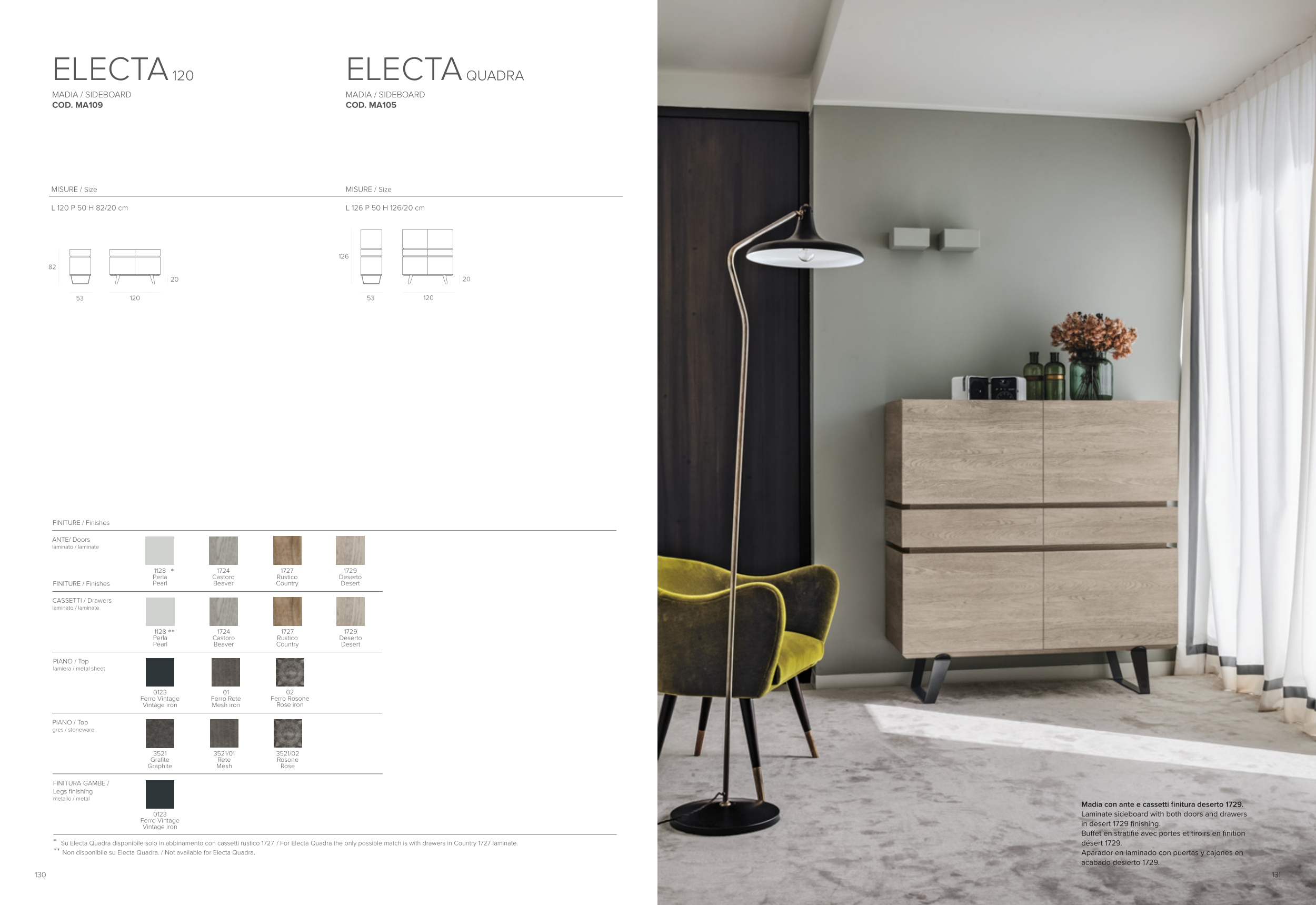 * Su Electa Quadra disponibile solo in abbinamento con cassetti rustico 1727. / For Electa Quadra the only possible match is with drawers in Country 1727 laminate.
