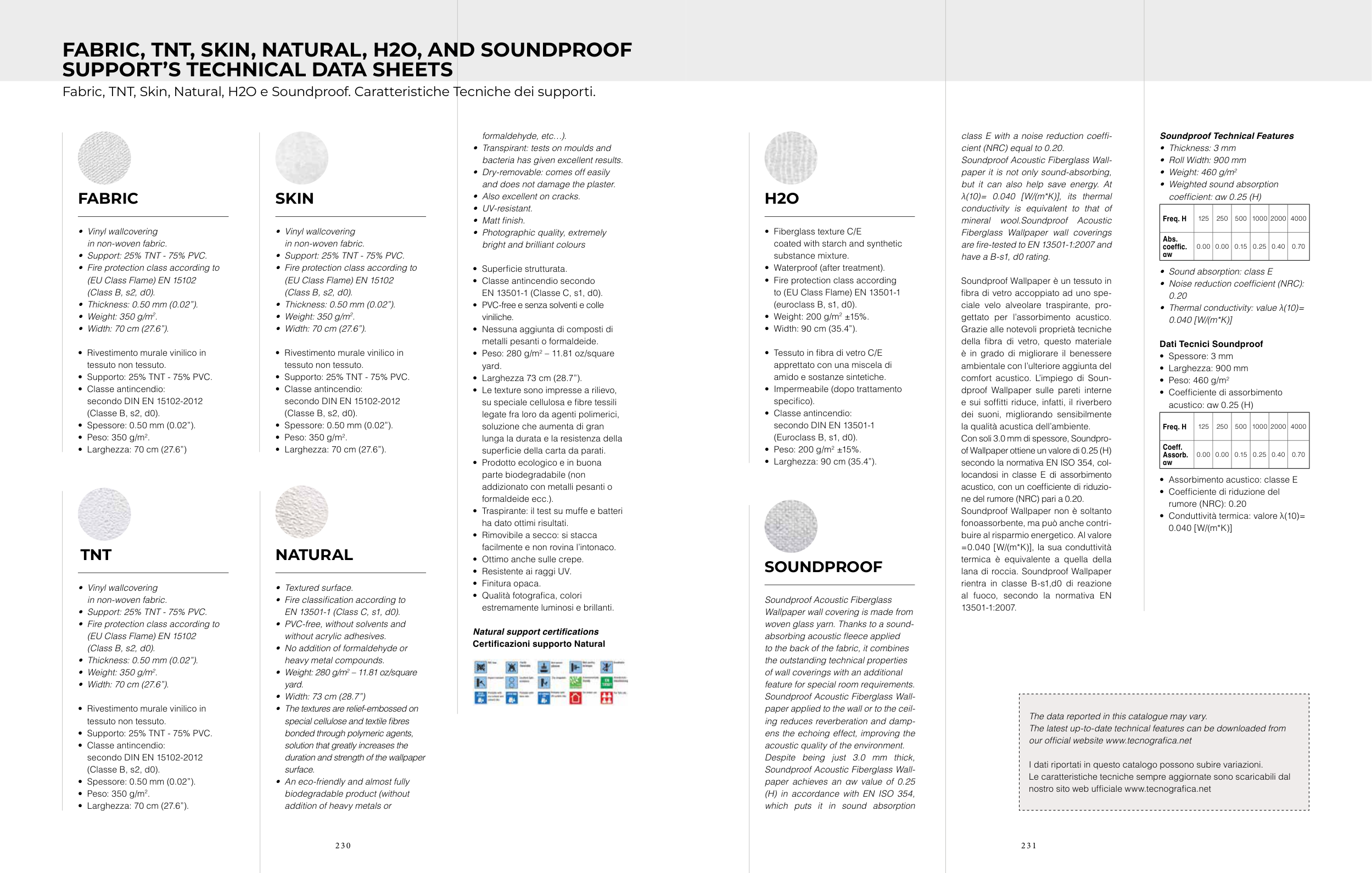 Fabric, TNT, Skin, Natural, H2O e Soundproof. Caratteristiche Tecniche dei supporti.