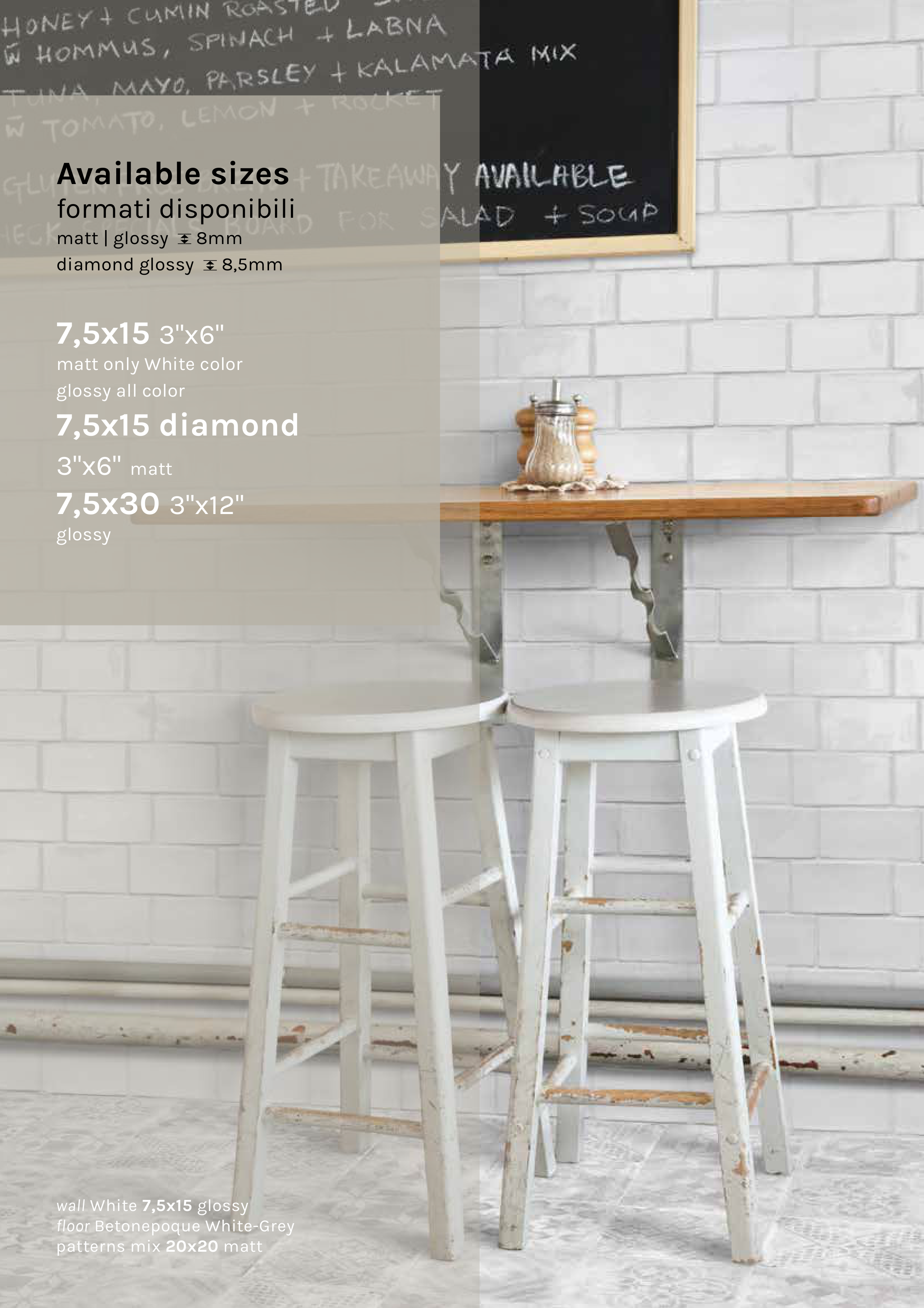 218 wall White 7,5x15 glossy floor Betonepoque White-Grey patterns mix 20x20 matt Available sizes formati disponibili matt | glossy 8mm diamond glossy 8,5mm 7,5x15 3"x6" matt only White color glossy all color 7,5x15 diamond 3"x6" matt 7,5x30 3"x12" glossy