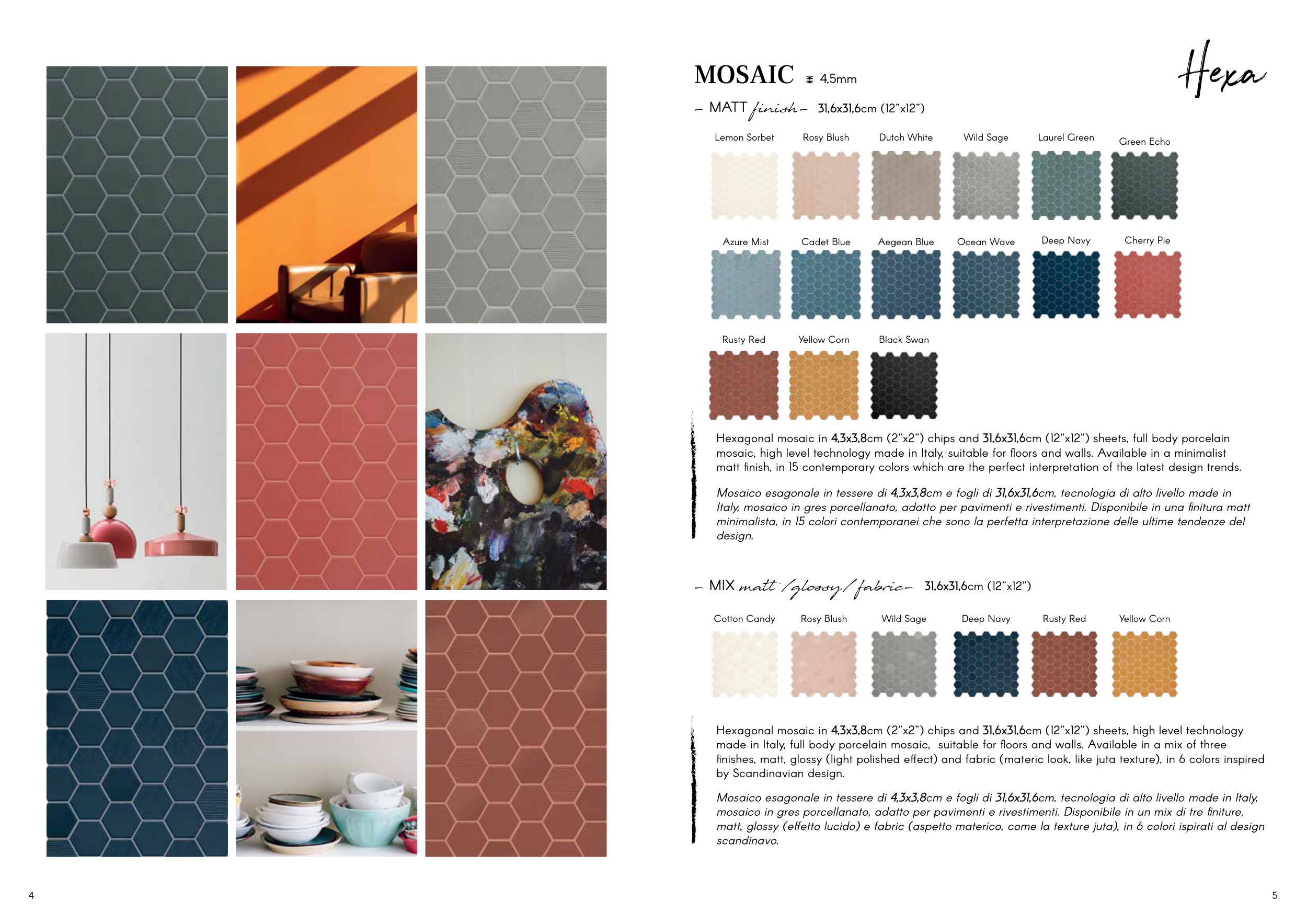 finishes, matt, glossy (light polished effect) and fabric (materic look, like juta texture), in 6 colors inspired