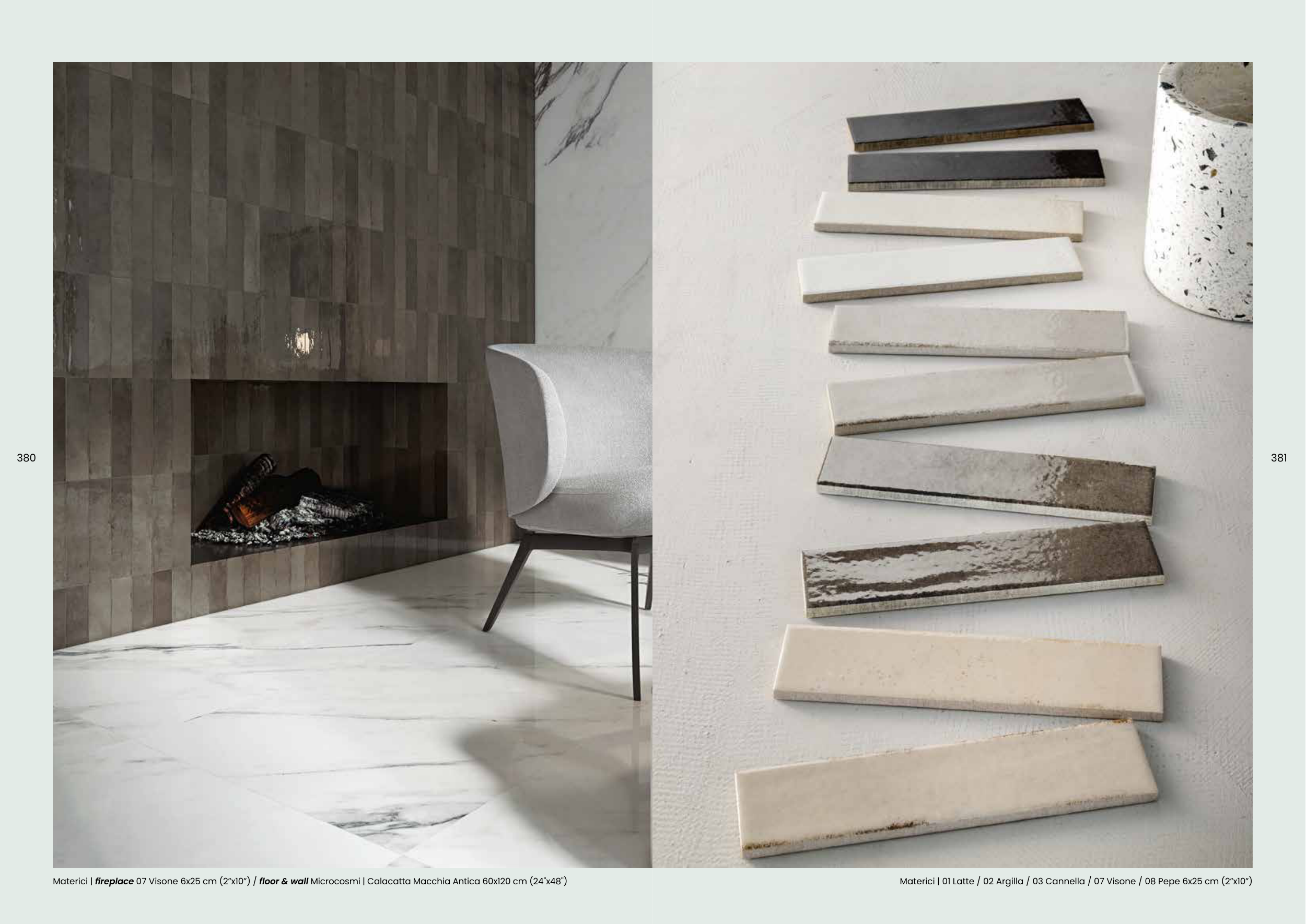 Materici | fireplace 07 Visone 6x25 cm (2”x10”) / floor & wall Microcosmi | Calacatta Macchia Antica 60x120 cm (24"x48")