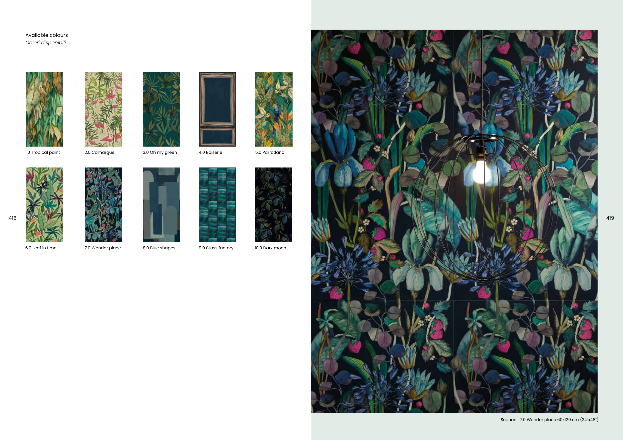 419 418 1.0 Tropical paint 2.0 Camargue 3.0 Oh my green 5.0 Parrotland 4.0 Boiserie 6.0 Leaf in time 7.0 Wonder place 8.0 Blue shapes 9.0 Glass factory 10.0 Dark moon Available colours Colori disponibili Scenari | 7.0 Wonder place 60x120 cm (24"x48")