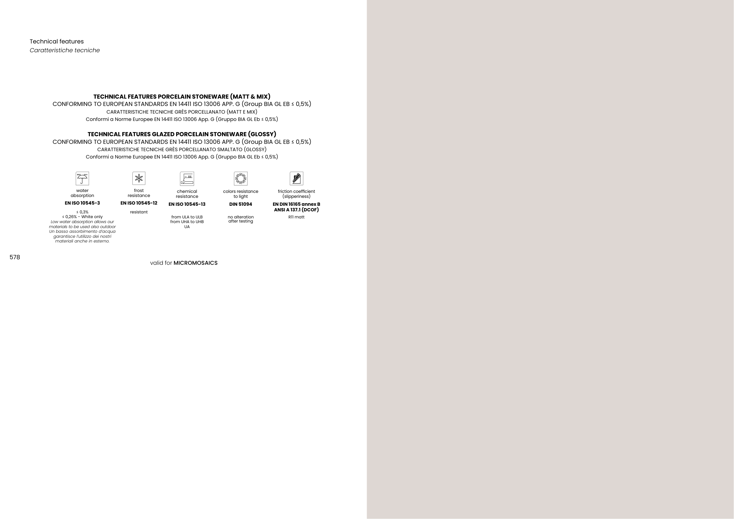 CONFORMING TO EUROPEAN STANDARDS EN 14411 ISO 13006 APP. G (Group BIA GL EB ≤ 0,5%)