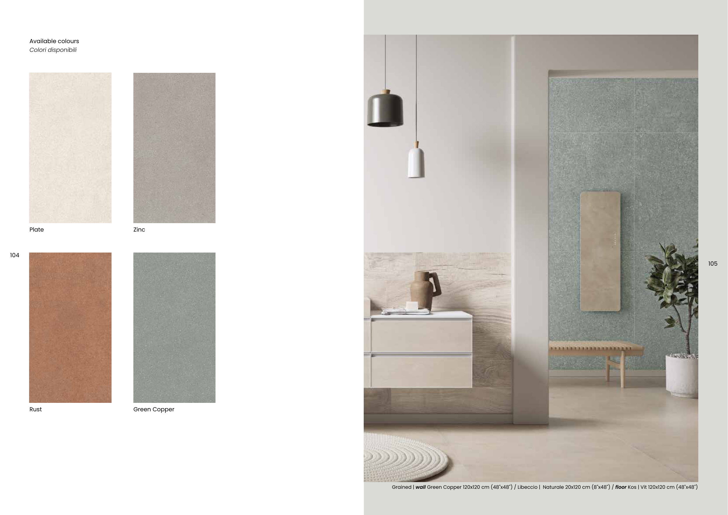 Grained | wall Green Copper 120x120 cm (48"x48") / Libeccio | Naturale 20x120 cm (8"x48") / floor Kos | Vit 120x120 cm (48"x48")
