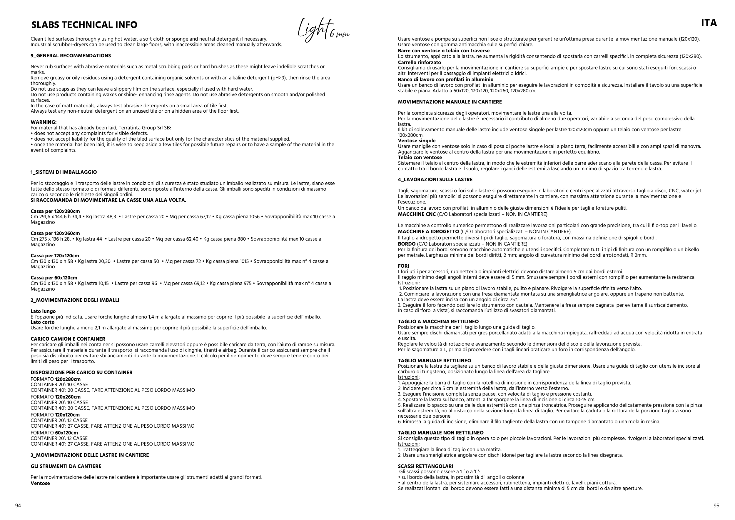 Cm 291,6 x 144,6 h 34,4 • Kg lastra 48,3 • Lastre per cassa 20 • Mq per cassa 67,12 • Kg cassa piena 1056 • Sovrapponibilità max 10 casse a
