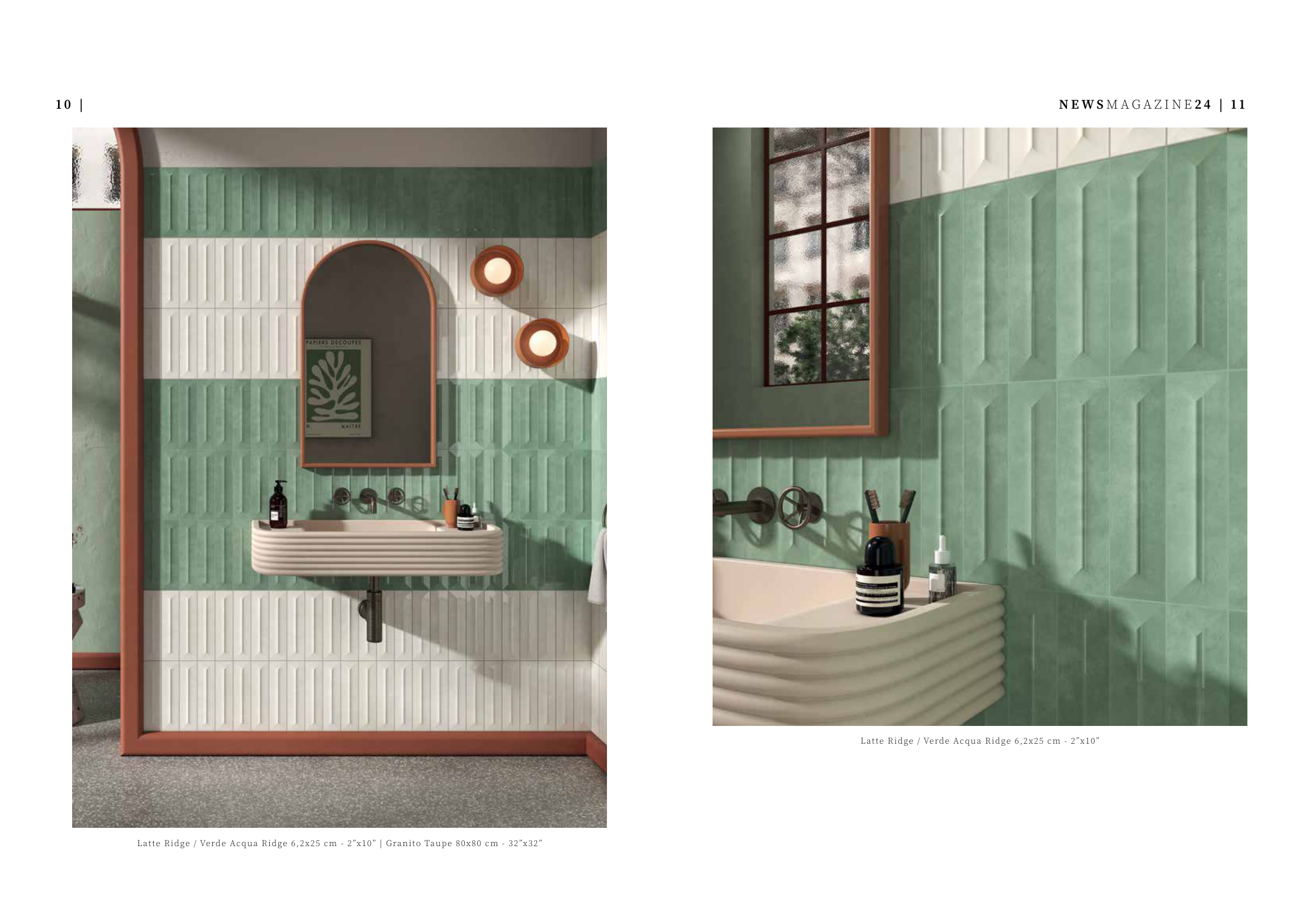 Latte Ridge / Verde Acqua Ridge 6,2x25 cm - 2”x10” | Granito Taupe 80x80 cm - 32”x32”