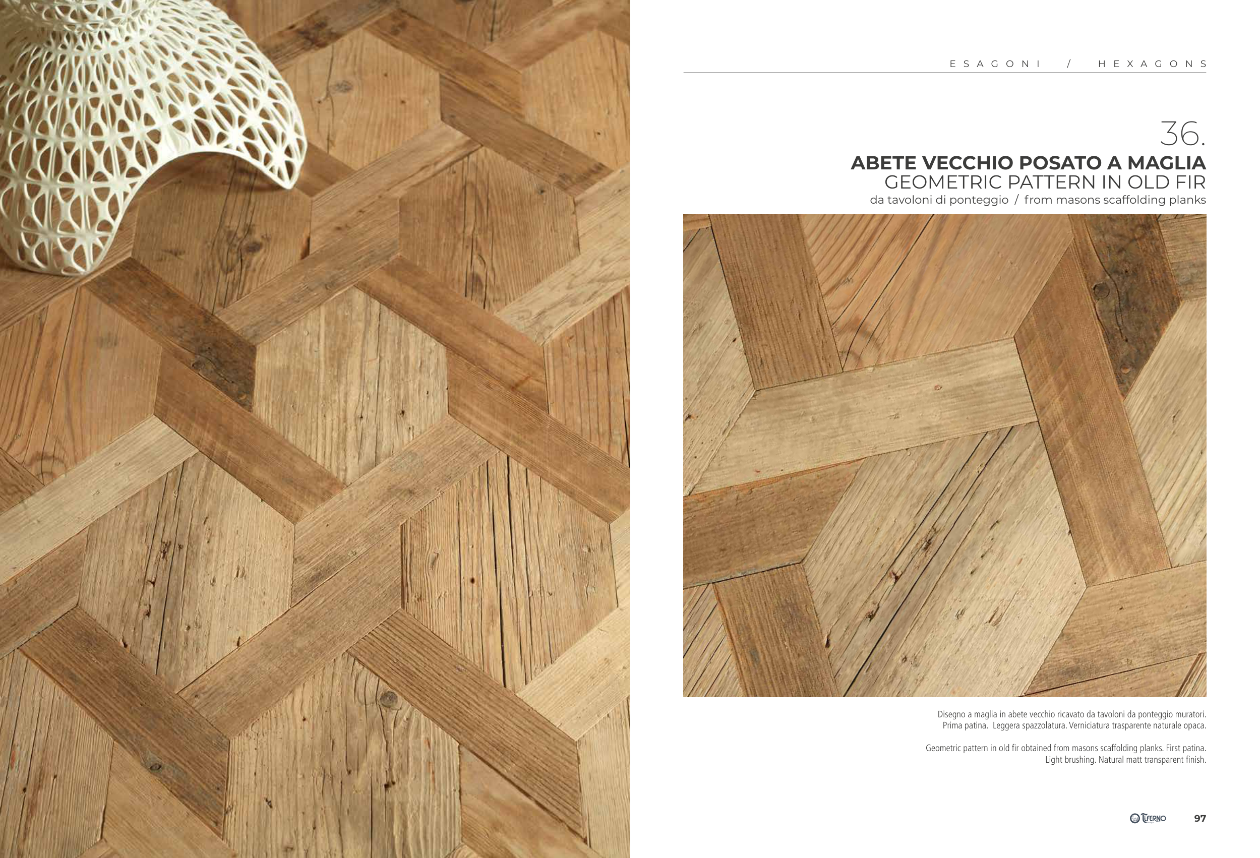 Prima patina. Leggera spazzolatura. Verniciatura trasparente naturale opaca.