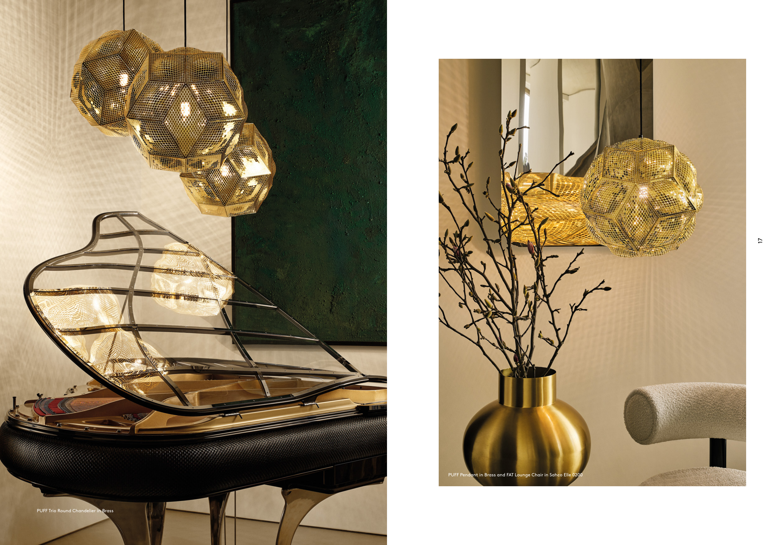 PUFF Pendant in Brass and FAT Lounge Chair in Sahco Elle 0200