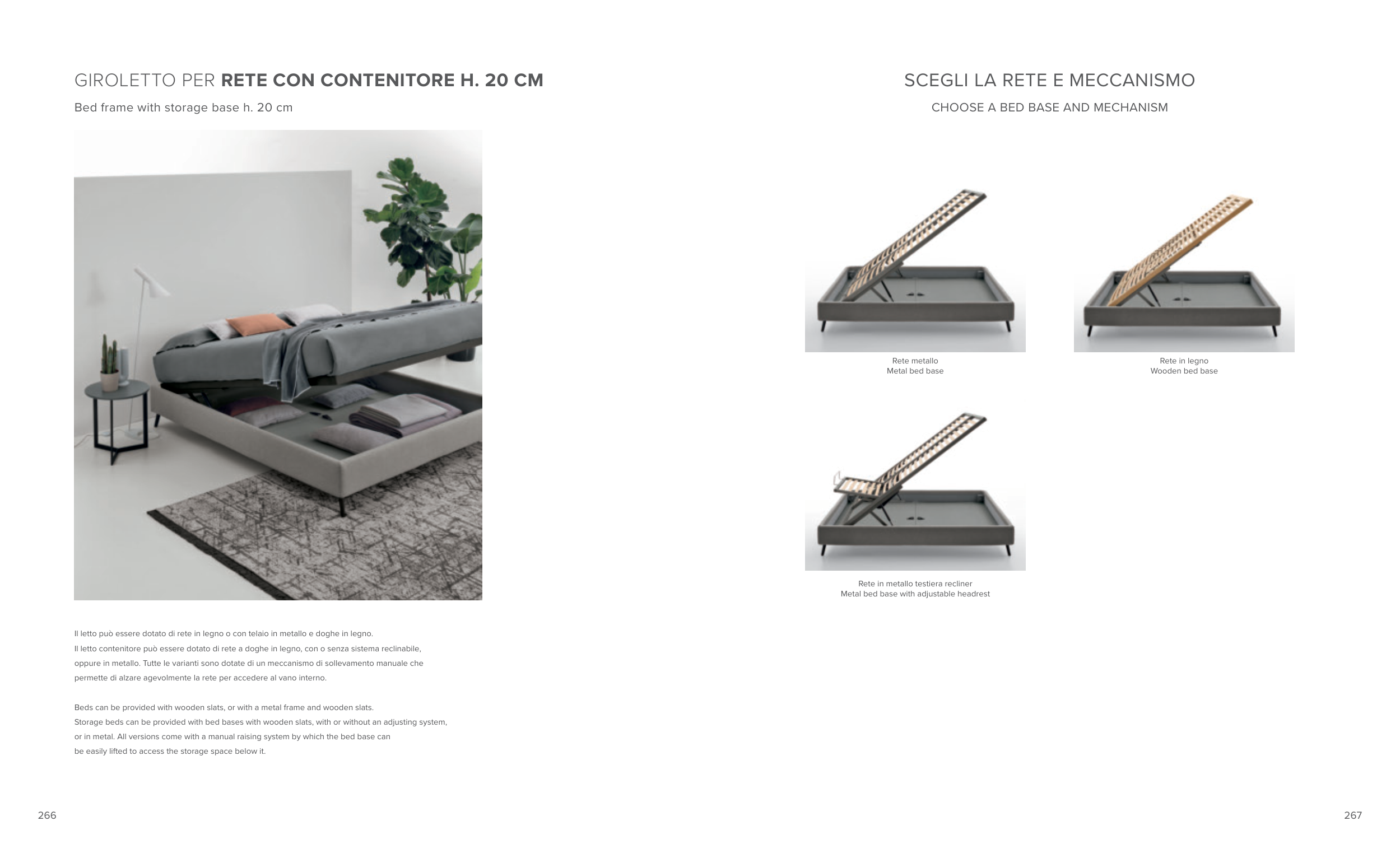 or in metal. All versions come with a manual raising system by which the bed base can