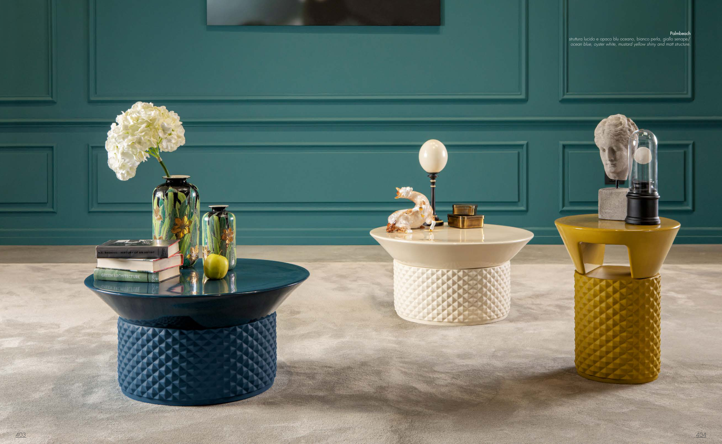 ocean blue, oyster white, mustard yellow shiny and matt structure.