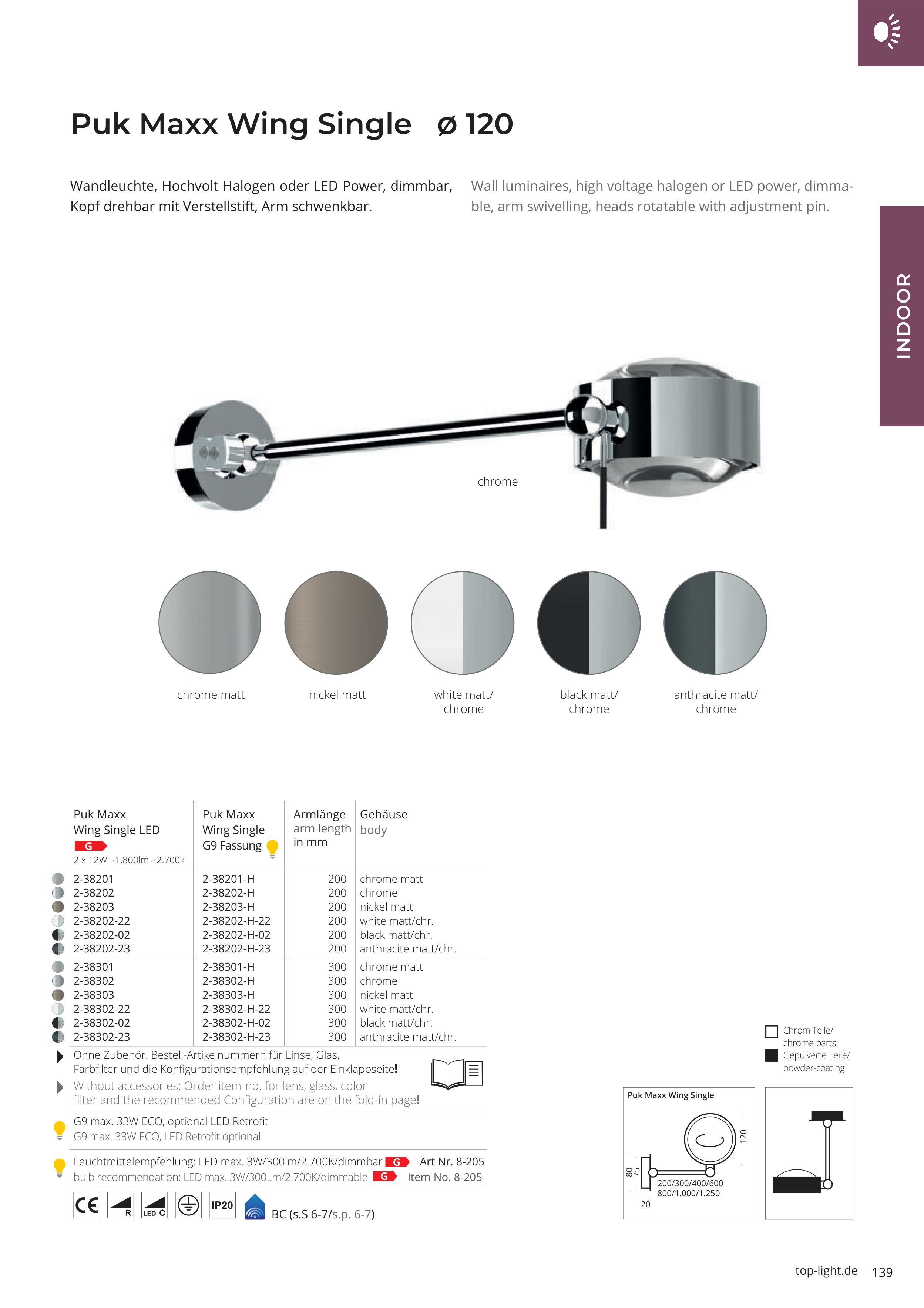 bulb recommendation: LED max. 3W/300Lm/2.700K/dimmable G Item No. 8-205