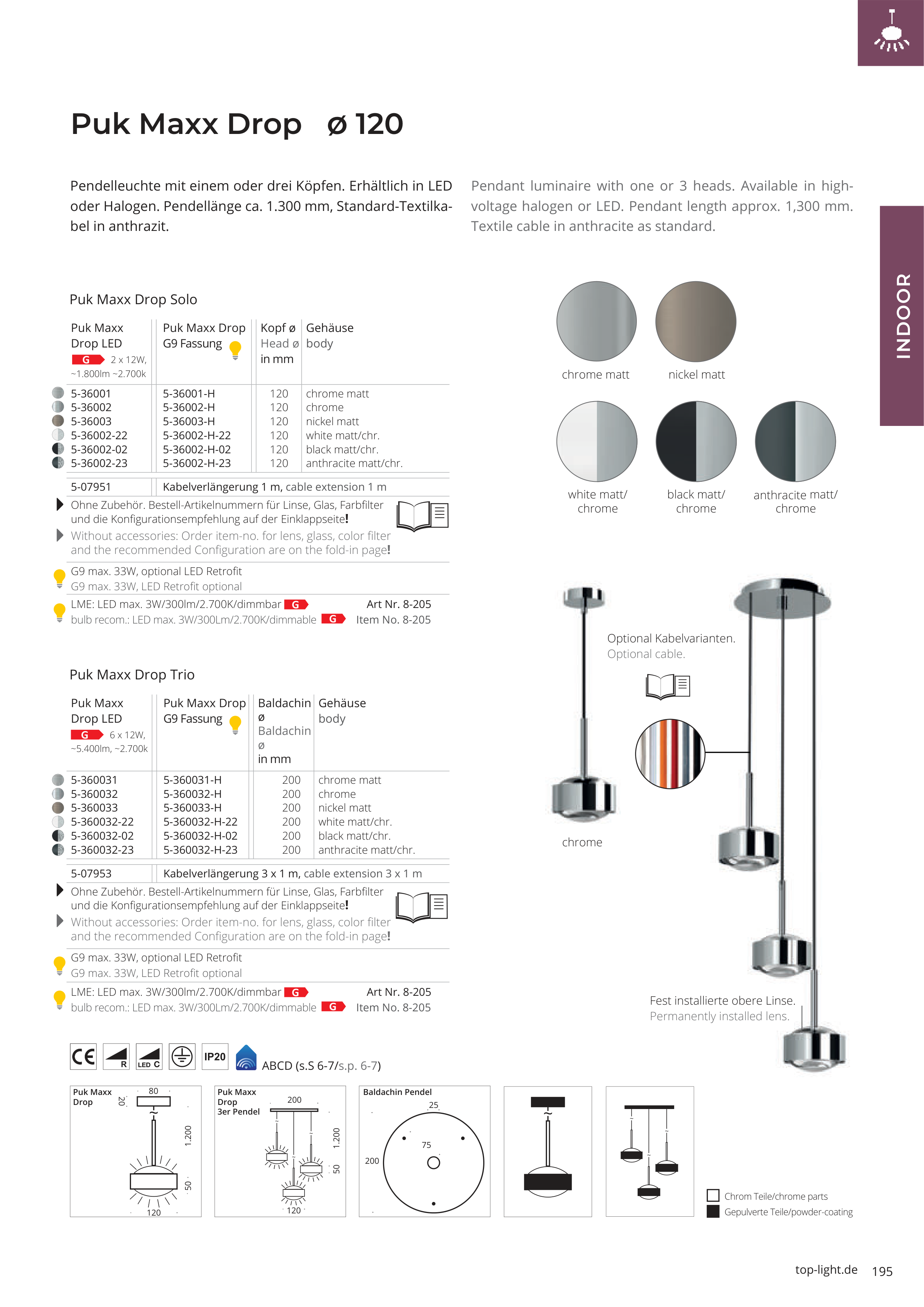 voltage halogen or LED. Pendant length approx. 1,300 mm.