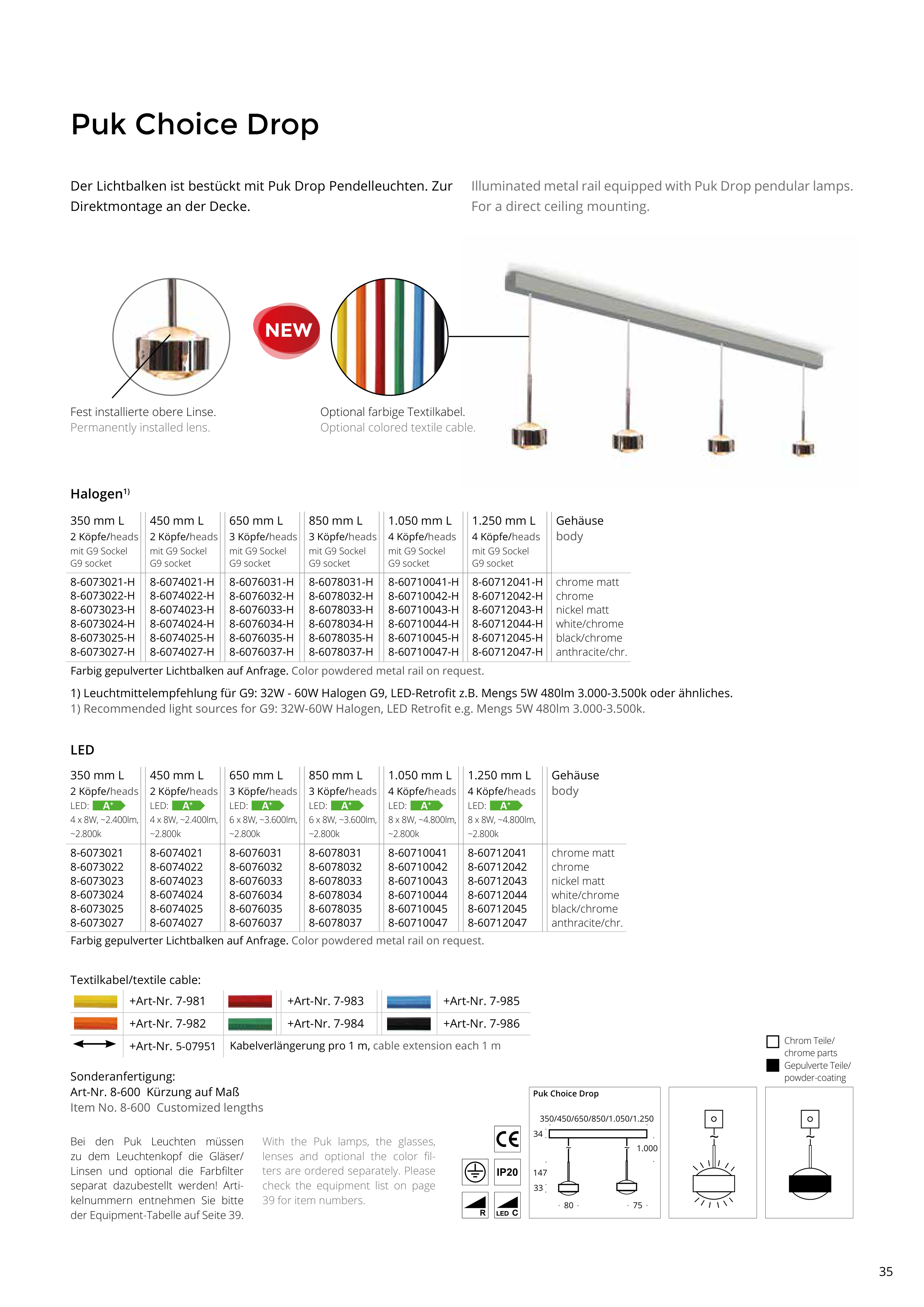 Der Lichtbalken ist bestückt mit Puk Drop Pendelleuchten. Zur