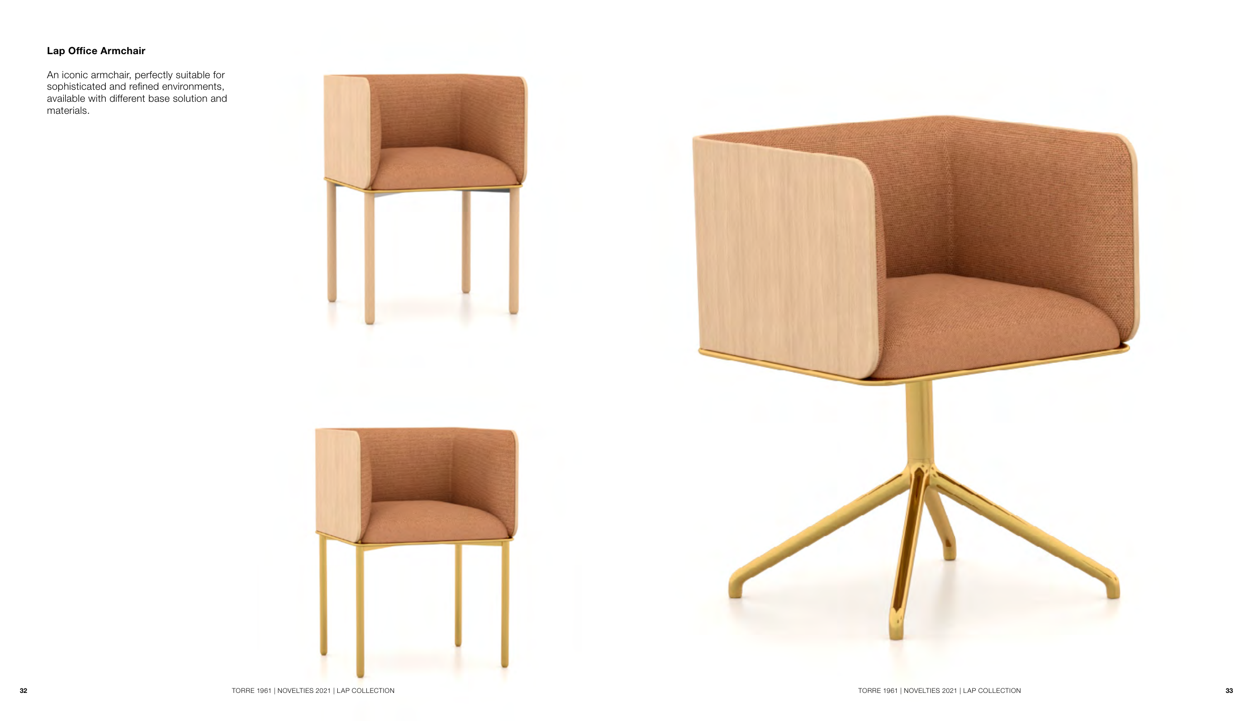 Lap Office Armchair An iconic armchair, perfectly suitable for sophisticated and refined environments, available with different base solution and materials. 32 33 TORRE 1961 | NOVELTIES 2021 | LAP COLLECTION TORRE 1961 | NOVELTIES 2021 | LAP COLLECTION