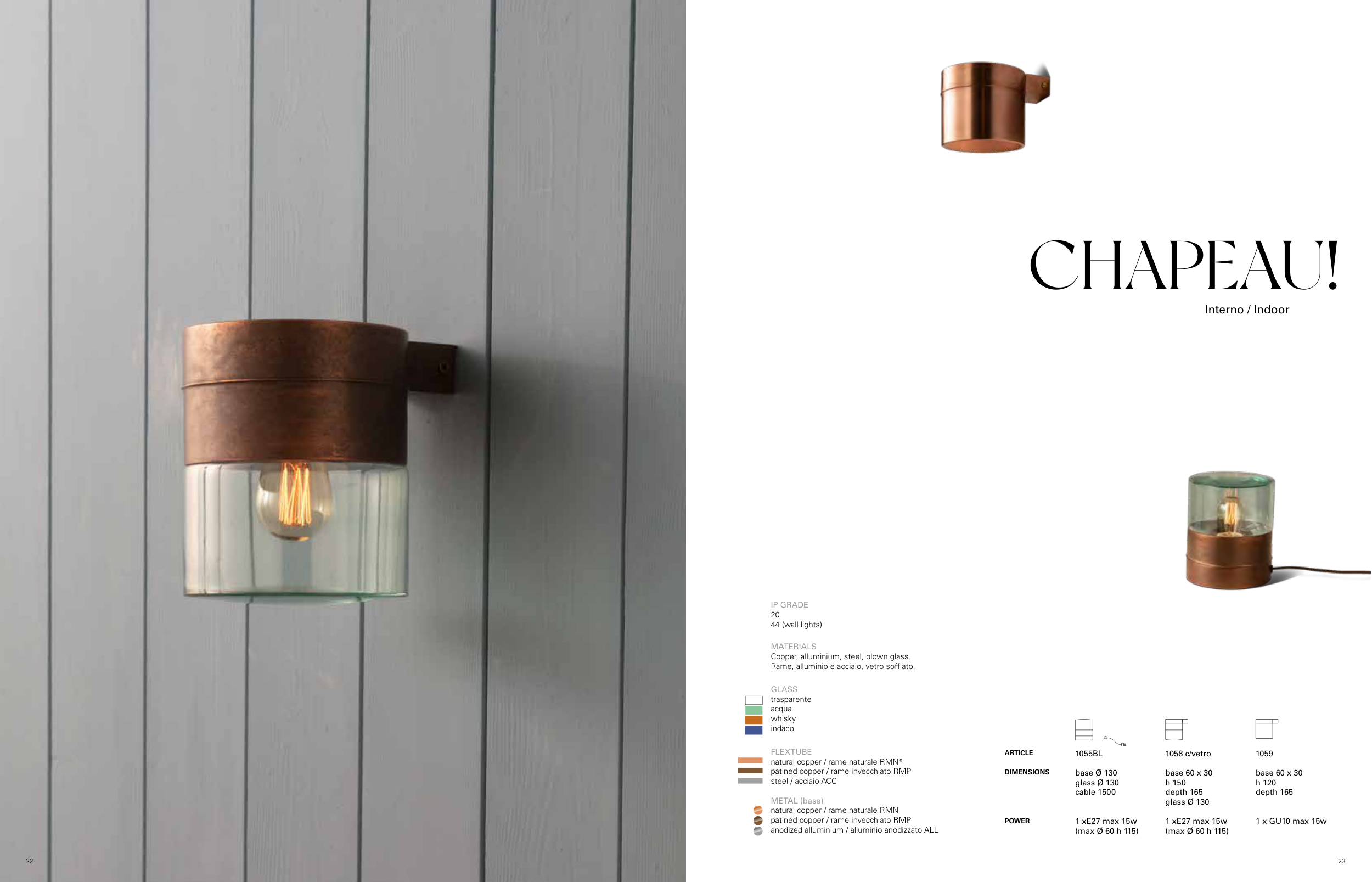 Rame, alluminio e acciaio, vetro soffiato.