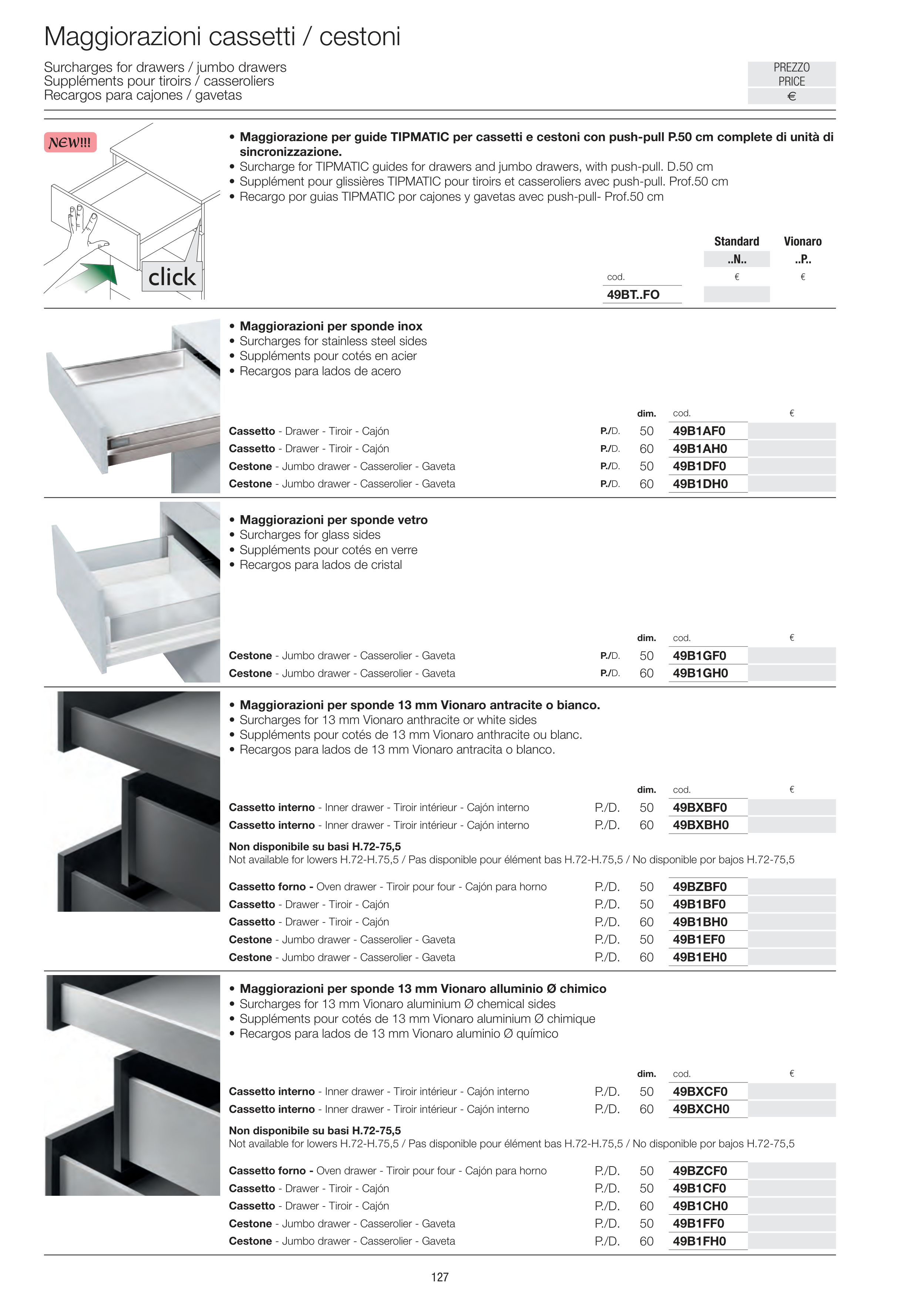 • Maggiorazione per guide TIPMATIC per cassetti e cestoni con push-pull P.50 cm complete di unità di