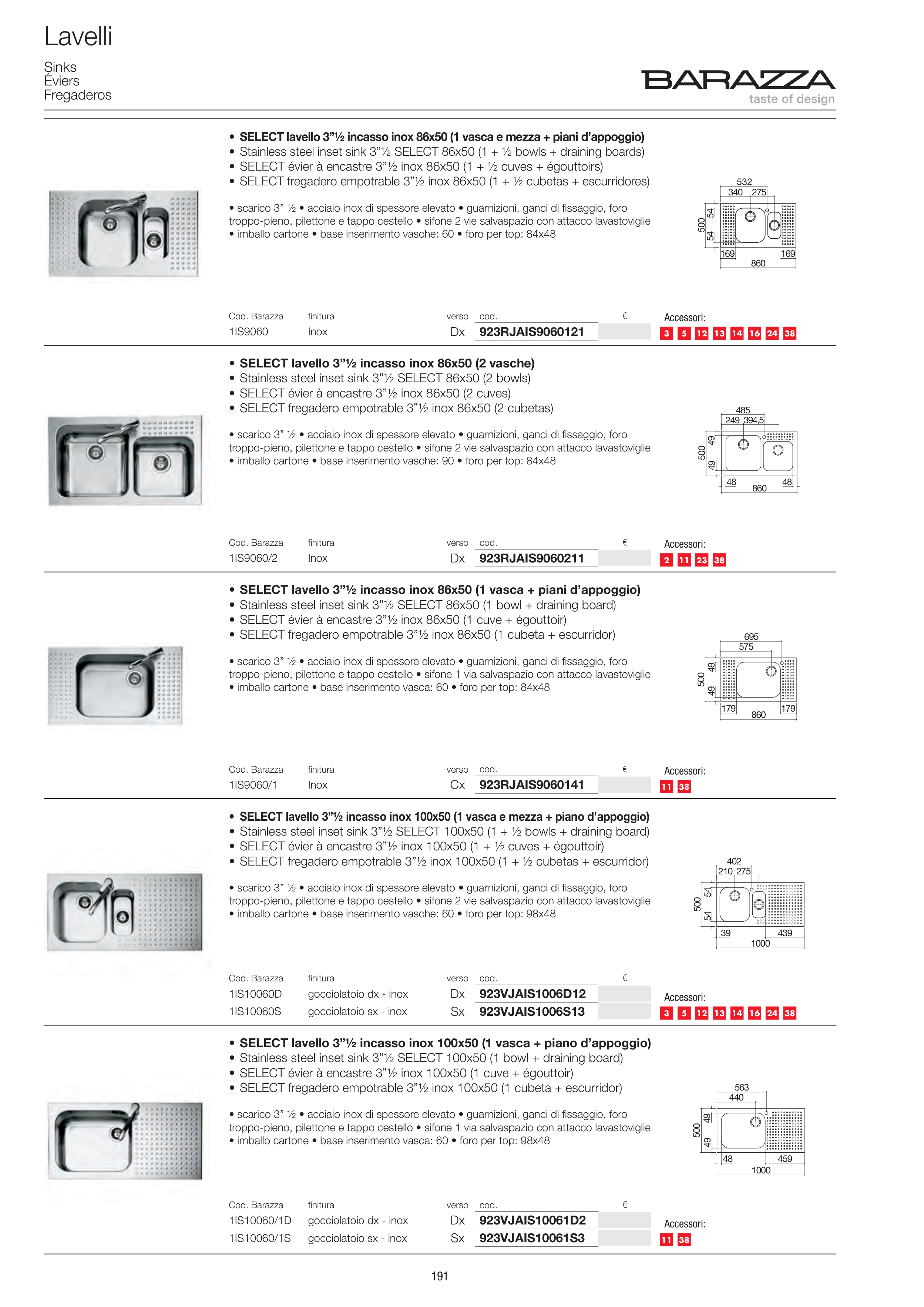 • Stainless steel inset sink 3”½ SELECT 86x50 (1 + ½ bowls + draining boards)