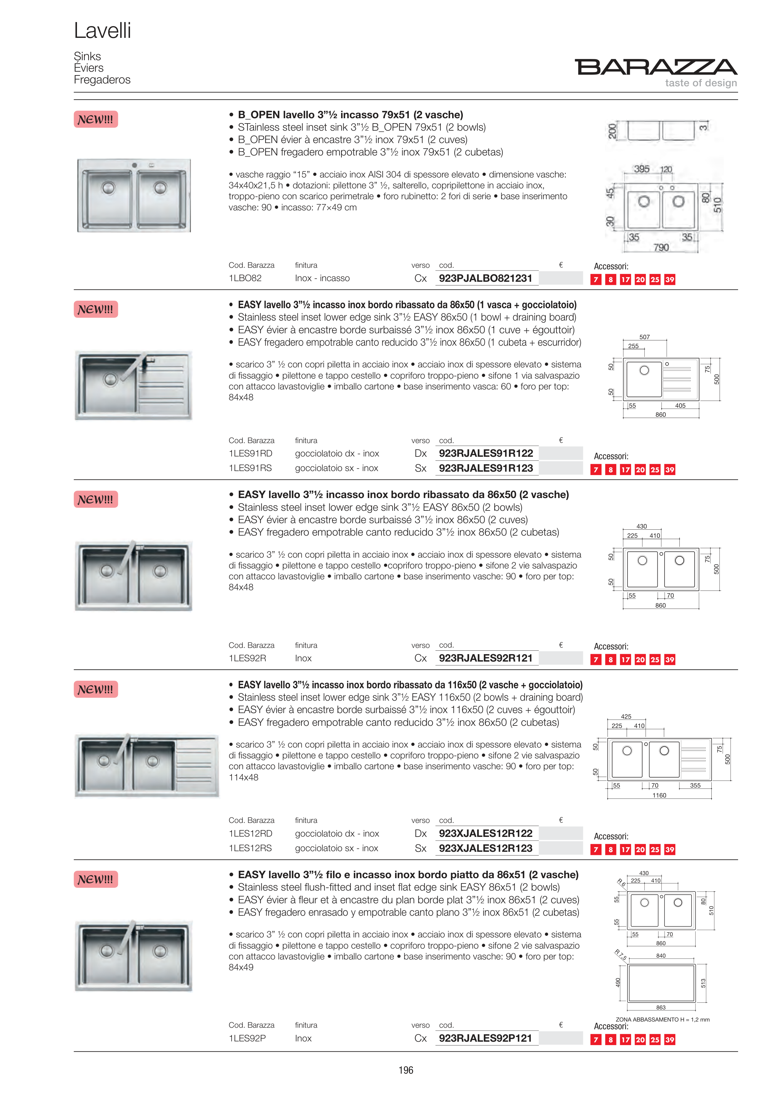 • EASY lavello 3”½ incasso inox bordo ribassato da 86x50 (2 vasche)