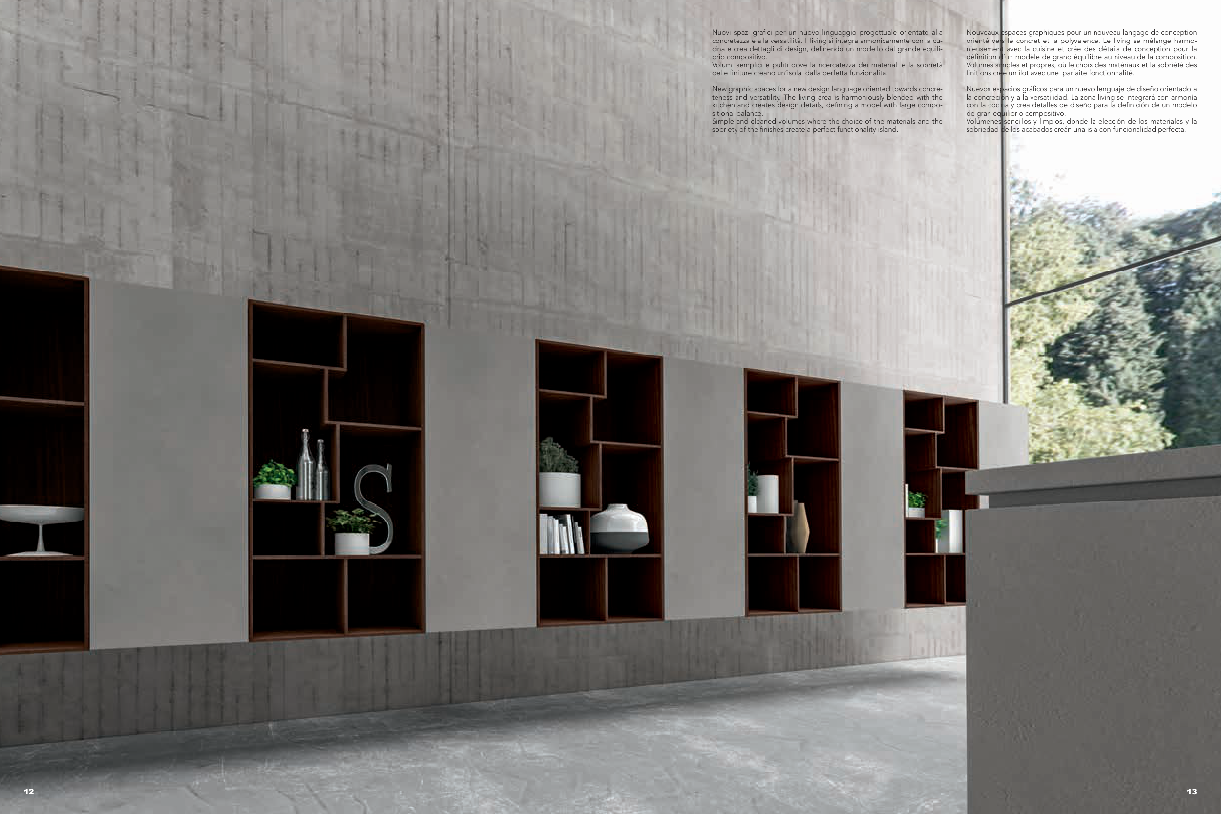 concretezza e alla versatilità. Il living si integra armonicamente con la cu-