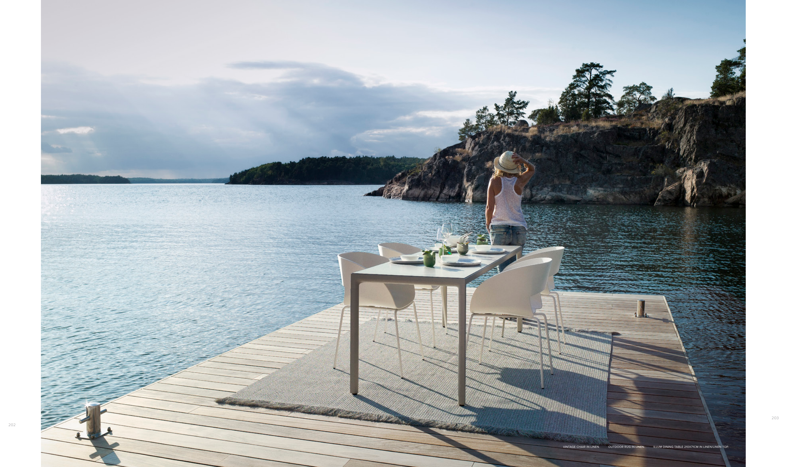 VINTAGE CHAIR IN LINEN. OUTDOOR RUG IN LINEN. ILLUM DINING TABLE 210X71CM IN LINEN/LINEN TOP.