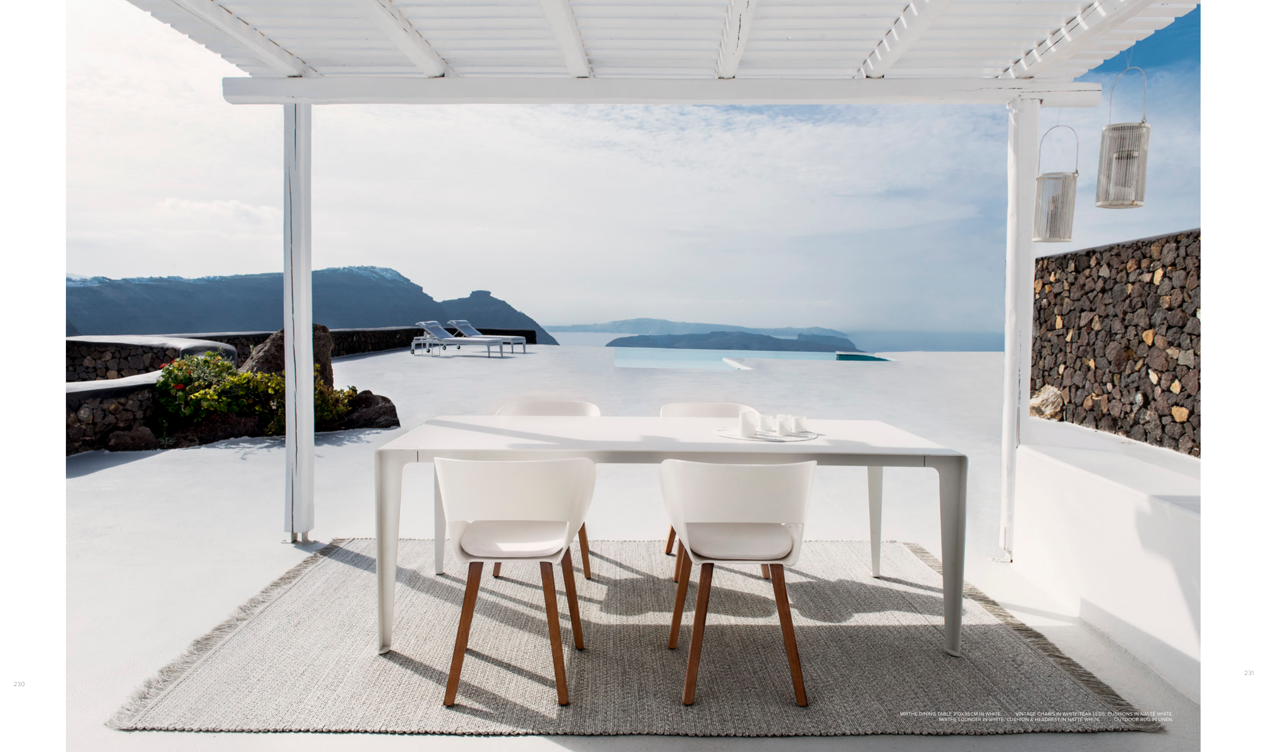 MIRTHE LOUNGER IN WHITE, CUSHION & HEADREST IN NATTÉ WHITE. OUTDOOR RUG IN LINEN.
