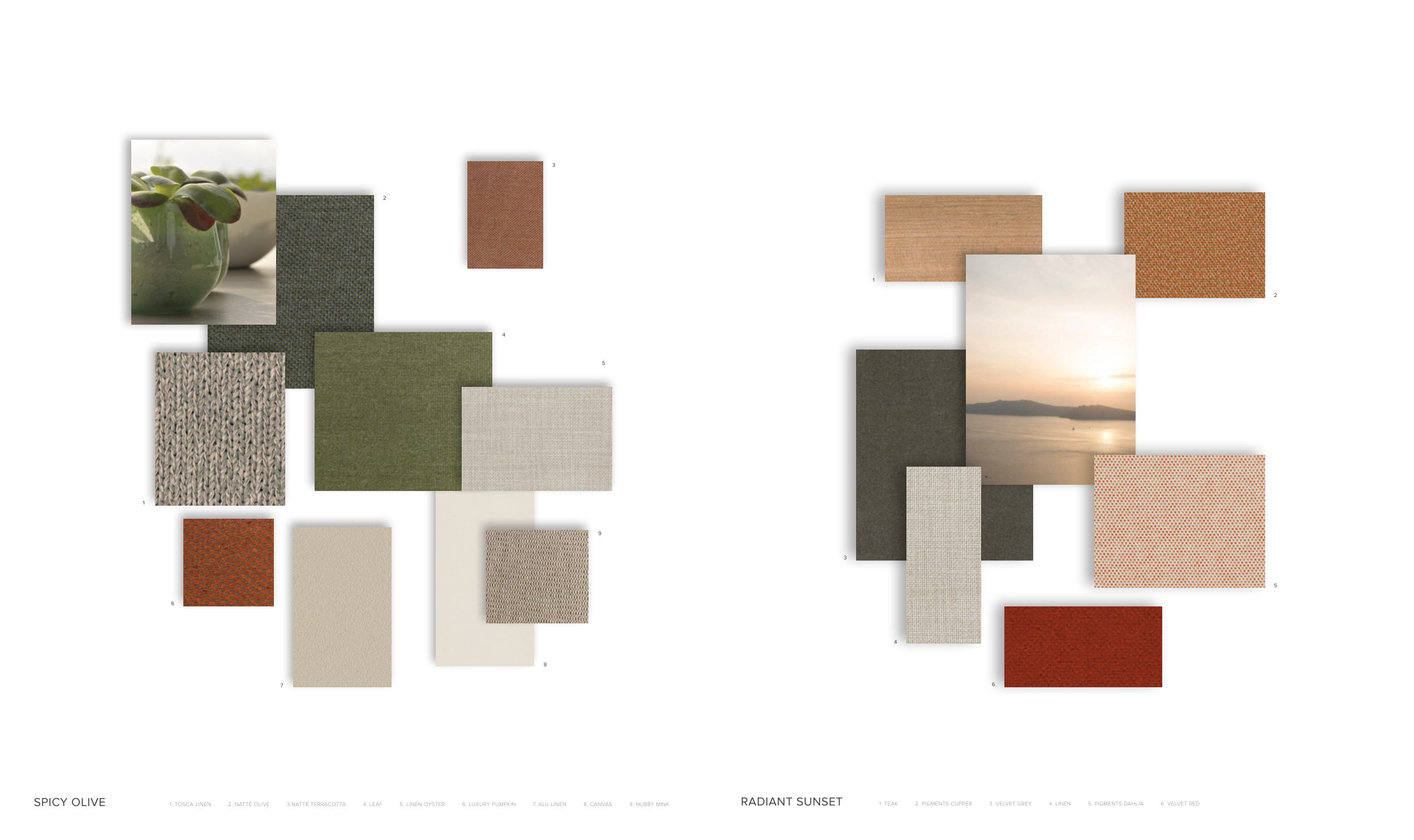 1. TOSCA LINEN 2. NATTÉ OLIVE 3.NATTÉ TERRACOTTA 4. LEAF 5. LINEN OYSTER 6. LUXURY PUMPKIN 7. ALU LINEN 8. CANVAS 9. NUBBY MINK