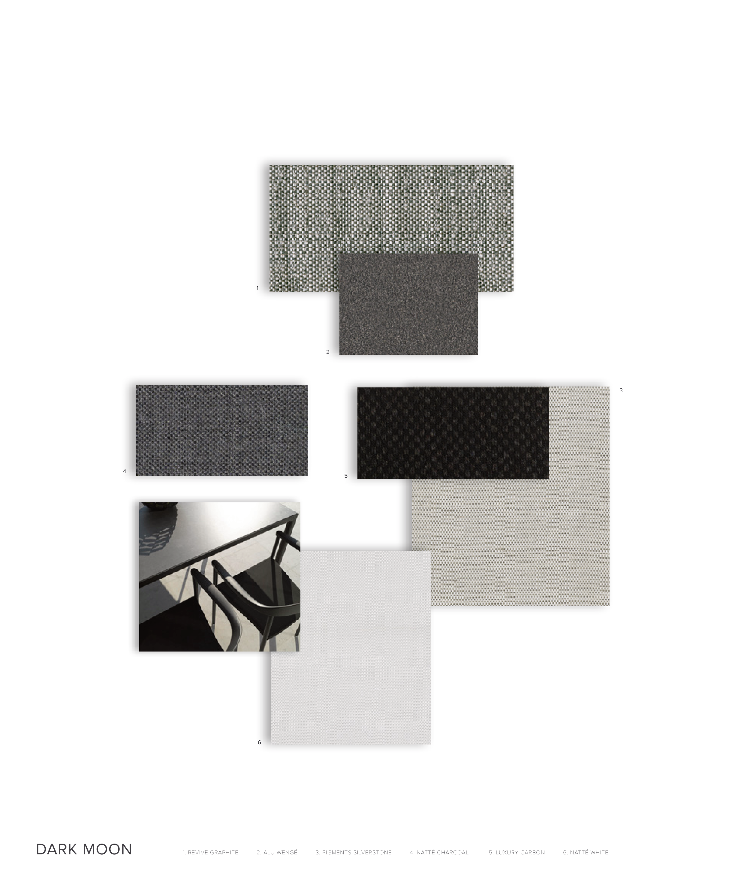 1. REVIVE GRAPHITE 2. ALU WENGÉ 3. PIGMENTS SILVERSTONE 4. NATTÉ CHARCOAL 5. LUXURY CARBON 6. NATTÉ WHITE